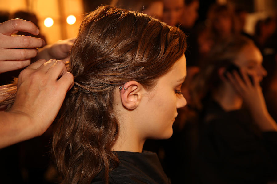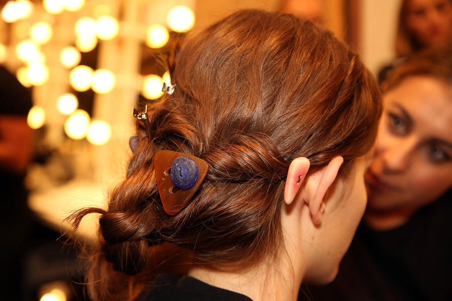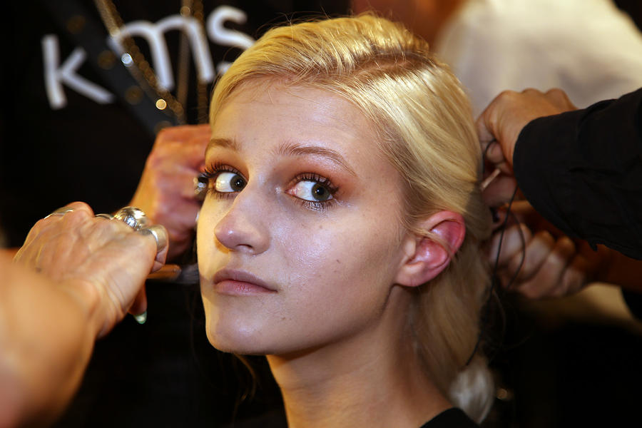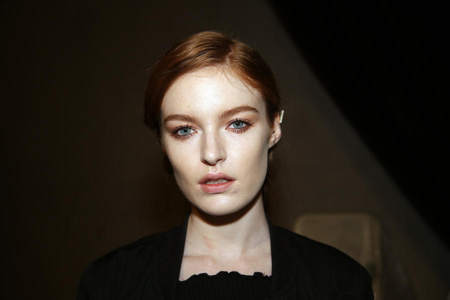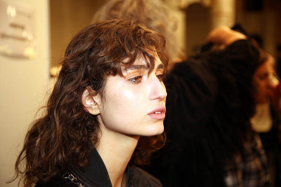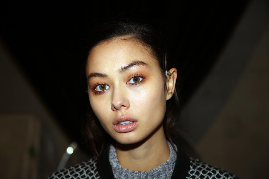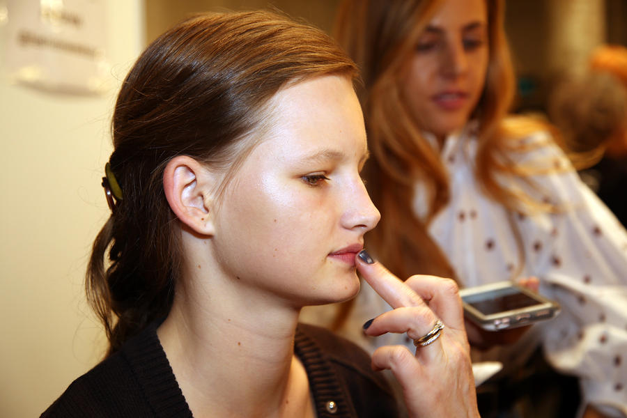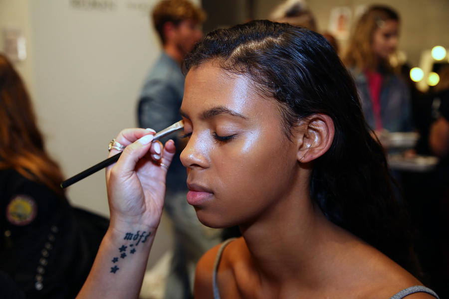 “I really wanted to do translucent matte skin which is probably the trickiest makeup to do. The reason we’ve gone for this is because Kit wants the girls to look super earthy - it’s not luxe, it’s just not that kind of show. On the skin, it’s all about creating natural skin with the least amount of products. We’ve massaged in M.A.C Mineralize Charged Water Skin Hydrating Mist and a little bit of oil to specific areas of the face that look quite dry, then we apply the M.A.C Prep + Prime Moisture Infusion. We’re trying to avoid foundation today but we’ve used the M.A.C Studio Finish Concealer that’s applied with a sponge and then we add the M.A.C Invisible Set Powder with a small brush - I really like how smoothing this product is. We’re not packing it on, rather spreading it out. In terms of the eye, we’ve used M.A.C Haute & Naughty Mascara in Brown which is nice and earthy and we’ve made it quite heavy against the clean skin. Then we’ve used the M.A.C Cream Color Base in Dusk which is a lovely rich colour, and on top of that we’ve used a creamy, nude lip stain which creates a glossy lid. Note - if you matte everything around a glossy moment, it makes the the gloss stand out without having to add more. Next we’ve applied M.A.C Yash Lipstick which counteracts the natural pink in the lips - this is dabbed on very lightly. For brows we’ve used a brow palette, we’ve wet the colours because we want strong but fluffy brows that evoke that tribal look. A dark charcoal colour is applied to create a bit of definition and body - this needs to be done fast so it doesn't look too polished.”