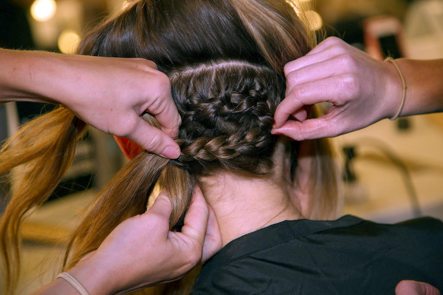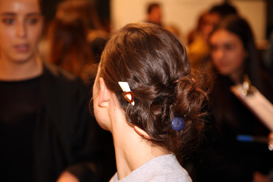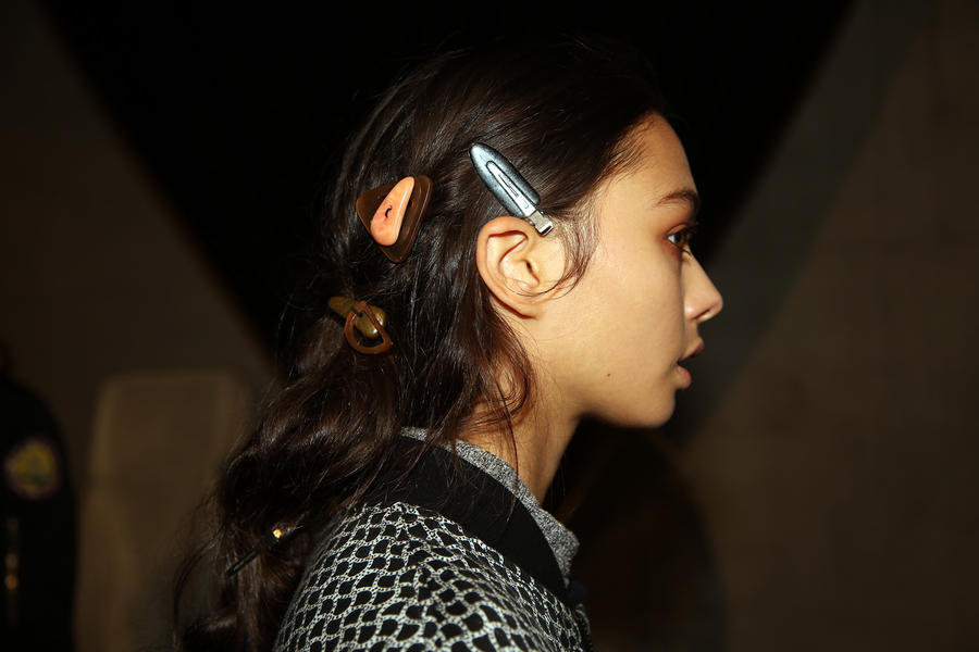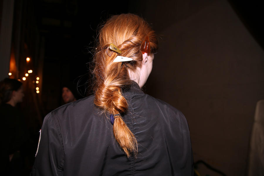 “The inspiration for the look is girl gang, it’s got spirit and is whimsical and unconventional, all the things that KITX celebrates in women. The hair feels a bit craft and DIY, we’ve used objects like buttons from KITX that we’ve sewn through the hair. There’s also a boyish, deep set part that goes through to the crown. The key products are the KMS Add Volume Styling Foam which is a great for using from the roots to the ends and gives an overall texture and grip to the hair. Then we’ve used the KMS Tame Frizz Smoothing Lotion which gives us shine and nice ripples in the hair. Then the hair is just tonged, knotted, twisted and sewn, rather than pinned in.”
