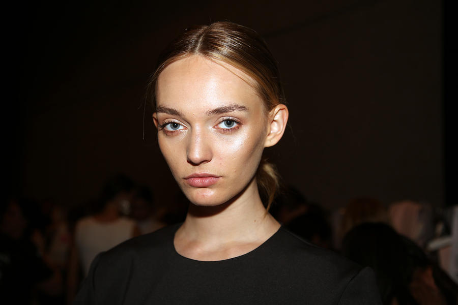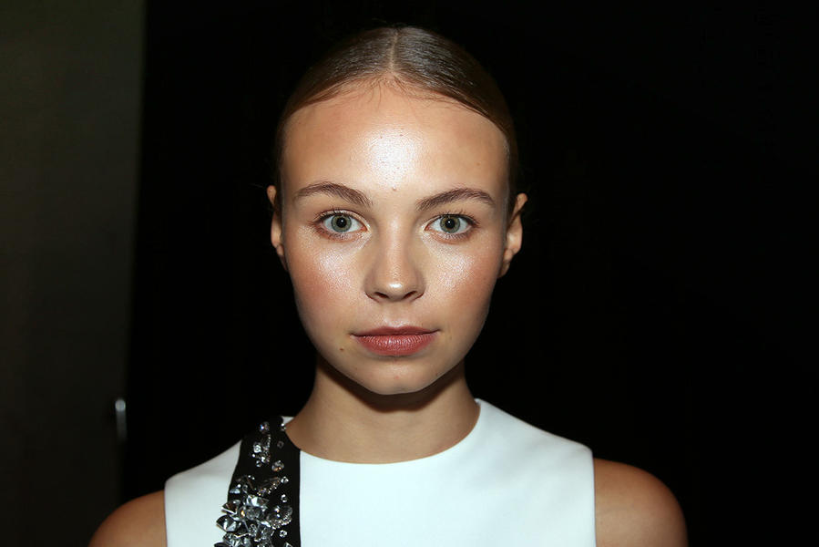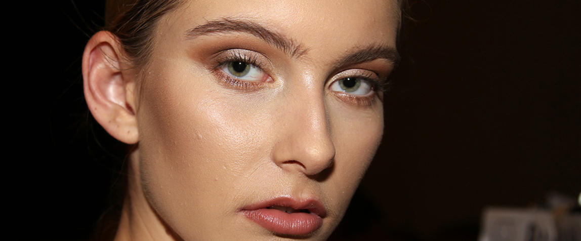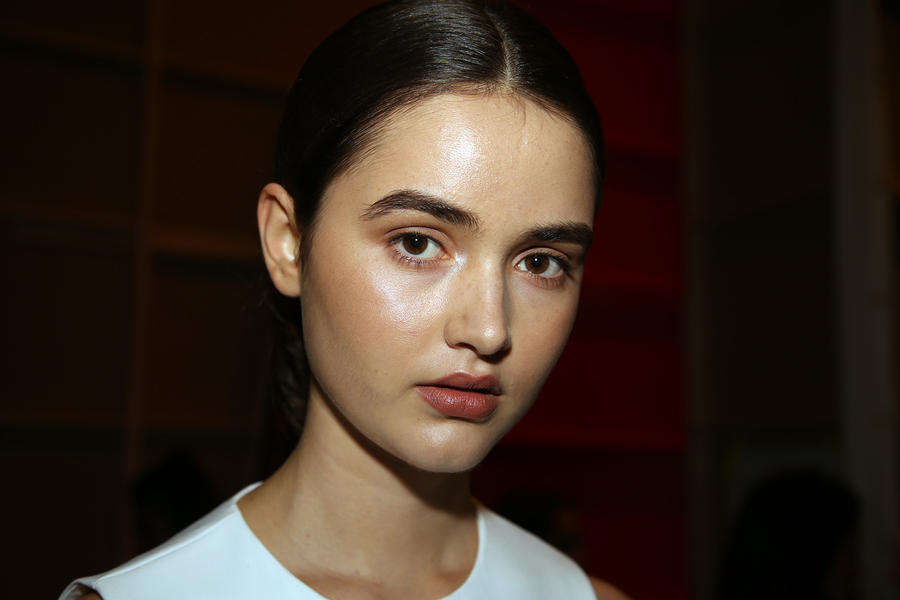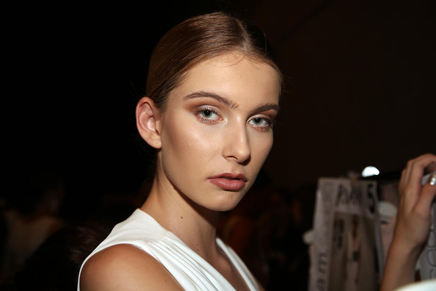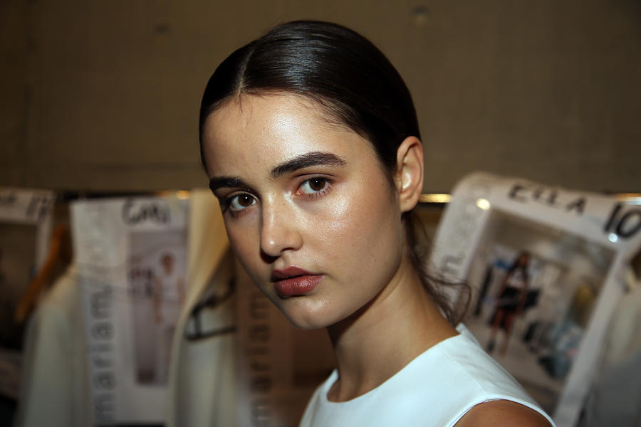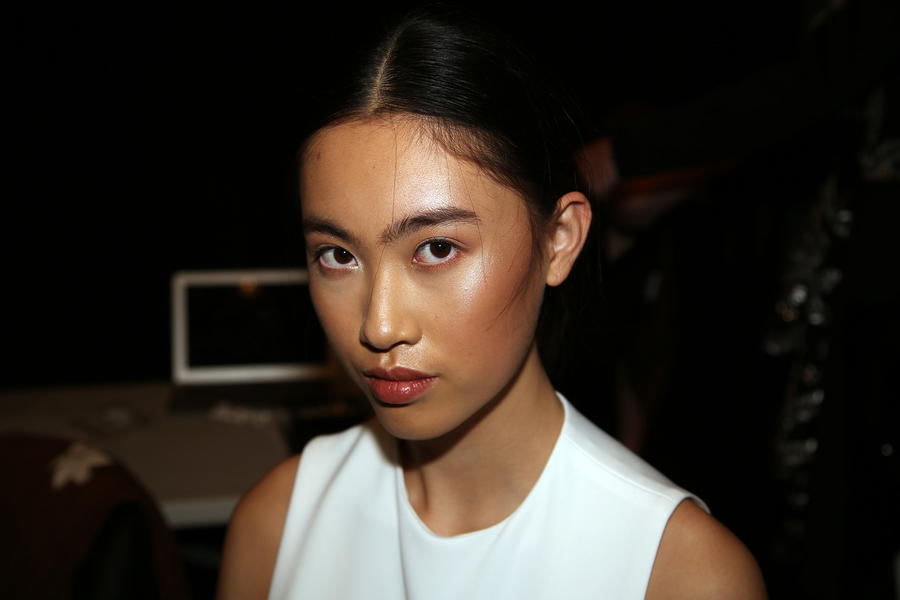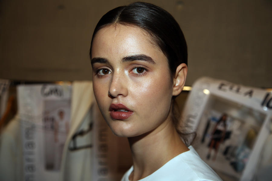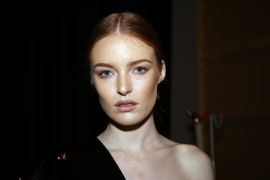 “So basically a lot of her clothing is quite detailed so she’s kept everything quite minimal with the hair and makeup. Really subtle and natural. Our makeup today is very wet, dewy and flawless. There’s not a lot of coverage with the foundation, brushed through brows, lips that look untouched with just a tint through them. The cheeks are quite bronzy and the eyes have a terra cotta wash over them with no structure or shape to it. The mascara is undone and just brushed through so it has a tint. To prep the skin we’ve used our Refreshing Face Mist, we then applied our Under Makeup Base. We next used our Liquid Illuminator on the cheekbones and eyes, our Freedom Eyeshadows all over the lid. Brow Shaping Gel through the brows and Waterproof Mascara. For the lips we’ve used a Soft Precision Pencil with some lipstick over the top.”