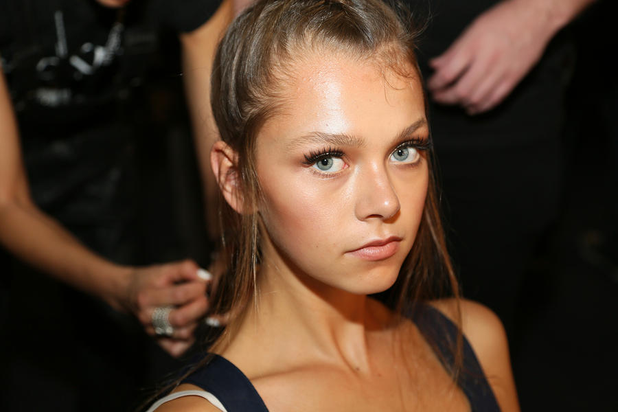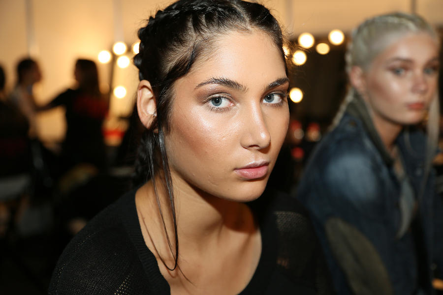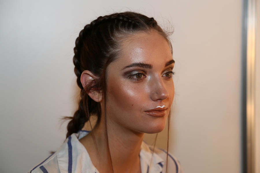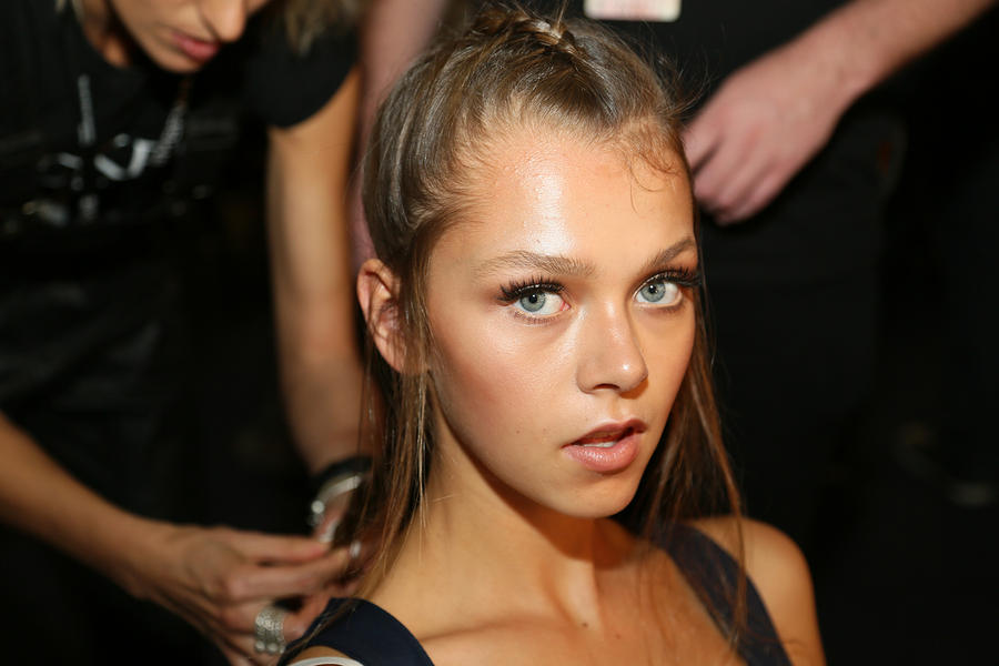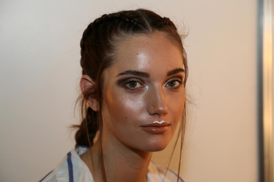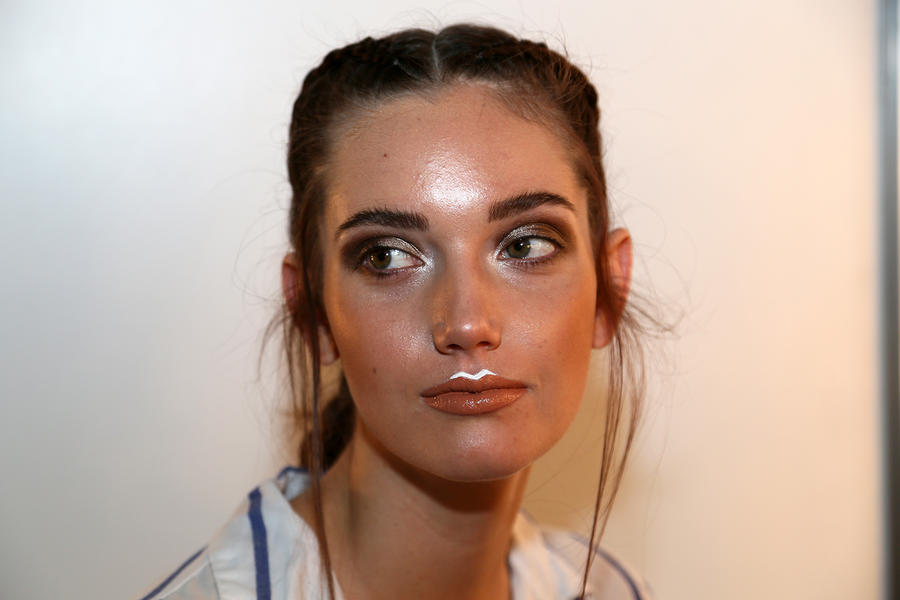Make-up look: "Today is the most beautiful luminous skin, so we want that transient luminosity coming through. We've got a very bronzed up eye and a thick lash on top of that to complement the girl's look. There is a bronzed cheek with loose powder over that. We have a white centre part on the cupid's bow of the lip and then a glossy lip to follow through."