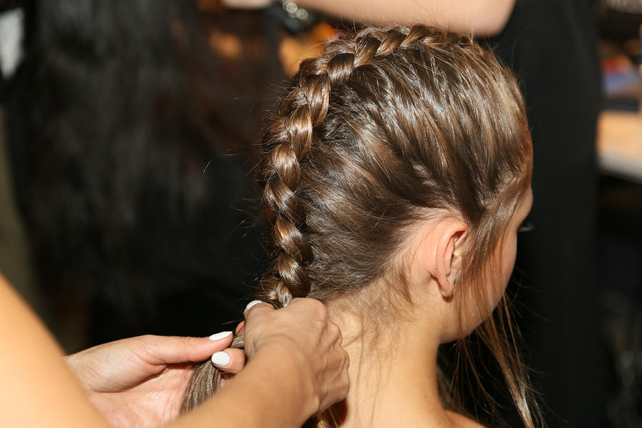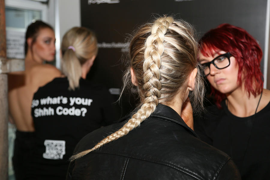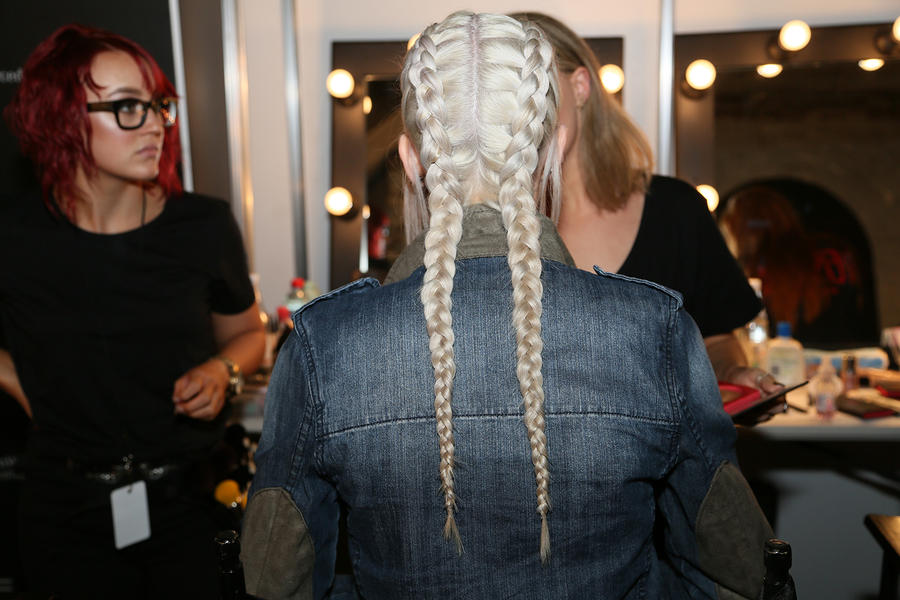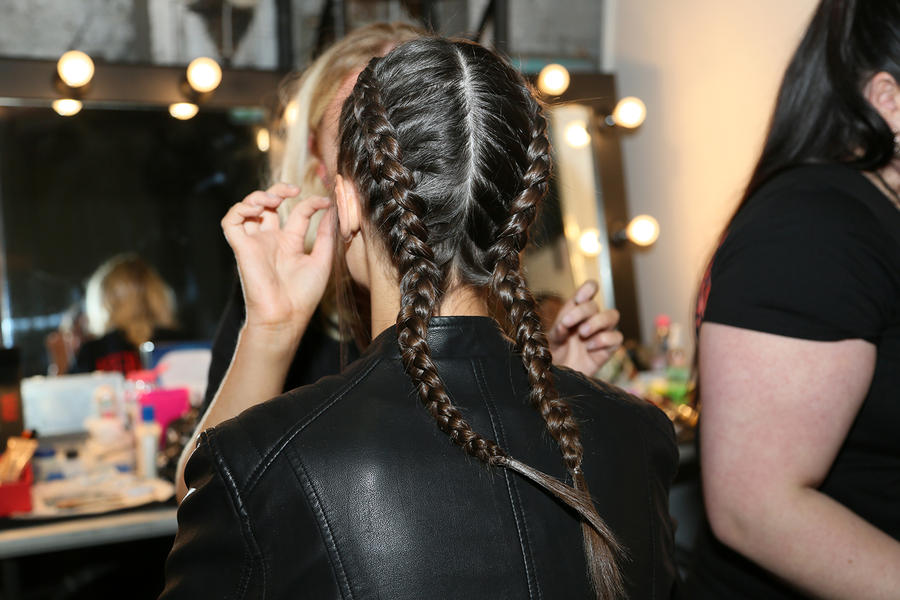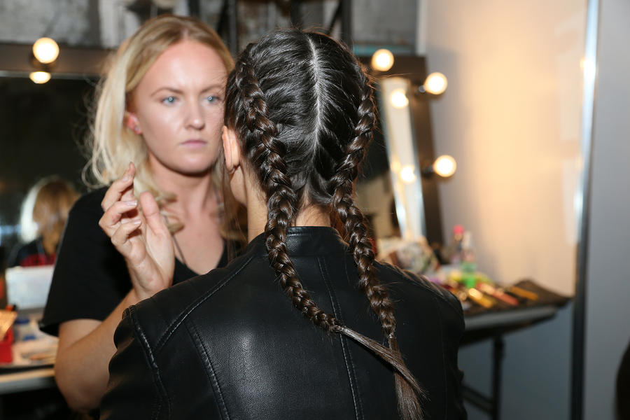 Hair look: “Our Bondi Bather girl is someone who has an outdoor lifestyle but she lives close to the inner city as well - so she's basically a glamorous utilitarian type. What we've done with the hair is two different braided designs with a sporty-come-fashion edge to it. One look has the one central braid and the other is splitting the hair in half with a centre part with braids down the sides. To get these looks, we've firstly used our Pillowproof Express Primer for heat protection and we've also coupled that with one of our volumises - the Rootful 06 - which is applied to dry hair. We then do a directional blowdry to get the hair back from the face and sitting up on the sides - which makes it easier with our sectioning. We then do our three strand braid - tie it off at the ends and then use the new Tripletake Finishing Spray to finish up the design."