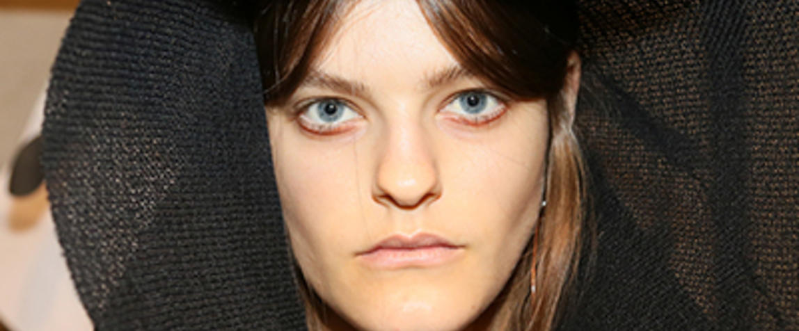 Make-up look: “The collection is inspired by images of earth from above - which has been created into the fabric. There are also these strong graphic lines that give an earthly movement, which we’ve created with today’s eye look that has a crescent shape representing those images. We’re giving skin a nice earth tone using the Chromacake to create it. On the skin, we’ve used Studio Waterweight Foundation which is super light and super hydrating - so it looks like it isn’t there but it perfects the skin. Softly highlighting - just making the skin glow, so the feature is the line on the eye. Conditioning the lips. We’re using a shadowy contour called Quit’trix Stick to contour as well as on the lips to nude them out leaving the focus on the line on the eye. Brows are soft and a little bit fluffy - there’s a tiny bit of definition using the Big Brow Pencil to brush those up. The designers wanted the make-up to be raw and minimal with a cool vibe.”