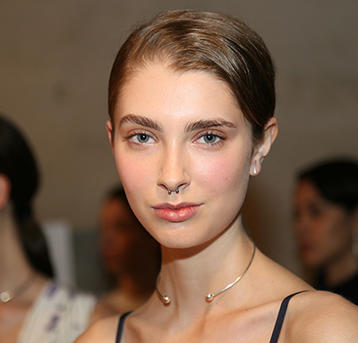 Make-up style: “Today's make-up look is about being very clean, fresh and modern - but at the same time being very rich and luxe. It's royal but with a bit of a twist - royalty being naughty. She looks like she's been running through the fields, so she has beautiful pink flush. She has a bitten lip and eyes are glossy. We're doing faux freckles around the cheek. We're using a concoction with Face Mist and Brow Shaper to create the faux freckles and then we're flicking it on with a toothbrush. We then diffused it with a tinted moisturiser to soften the edges."