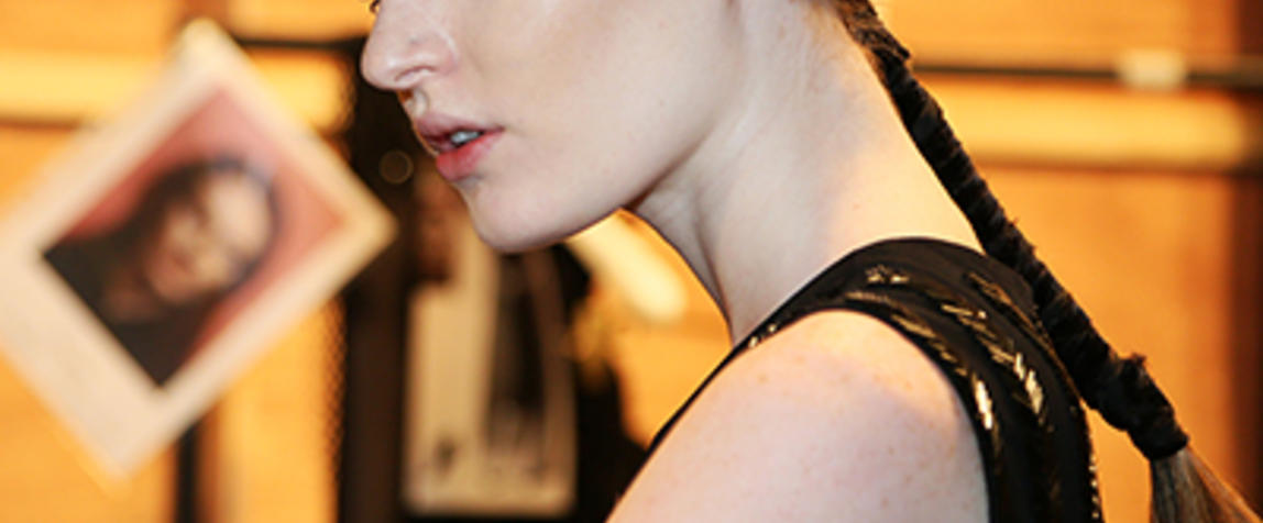 Hair look: "It’s sleek and young, using a centre part and a low ponytail which keeps it really modern. We’ve decided to wrap around it some black velvet, which we’ve distressed to make it luxe but modern at the same time. To keep the pony sleek we’ve used a small amount of dry wax on the top to lacquer the hair down and contain everything. At the end of day it’s just a ponytail - so it’s definitely wearable for the everyday. It’s all about how you choose to dress it - you could keep it simple or make it something really cool with a little ribbon.”