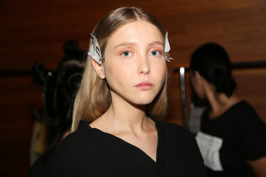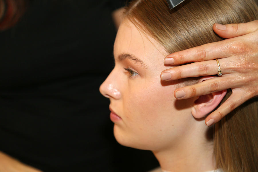 Hair look: “The inspiration comes from the collection - we really wanted to stay true to the brand's aethestics of being a little structured but also a little feminine and playful. Through the front, we've gone for a slick look. We're using a combination of the Heat Styling Protection and the Styling Gel and we're securing everything behind the ear. We want that area to be so shiny that as the runway lights hit the hair, you see that shiny band and it's very reflective. Everything below the ear, we're just doing a regular blow-out - just really soft and bouncy. For that, we're using a combination of the Styling Gel and the Oil Treatment."