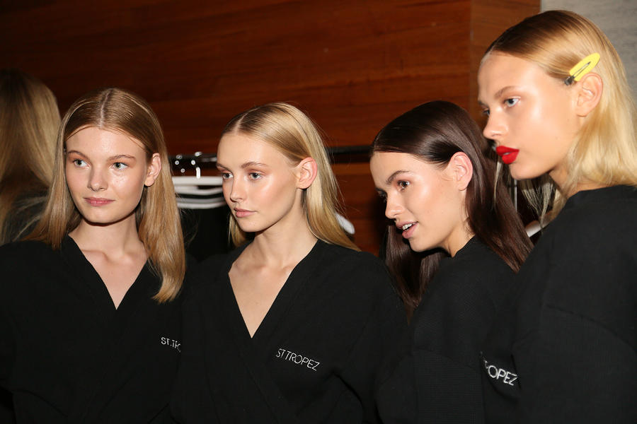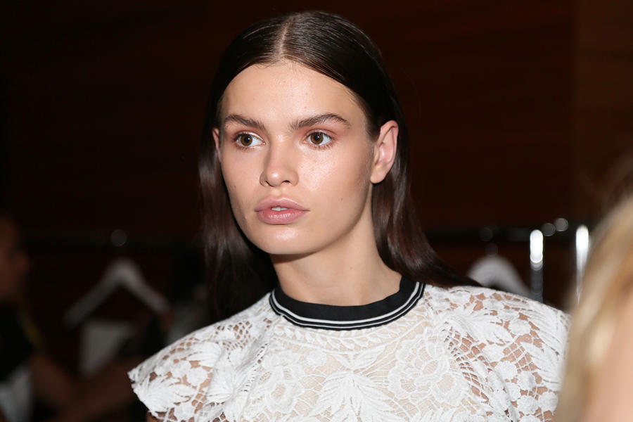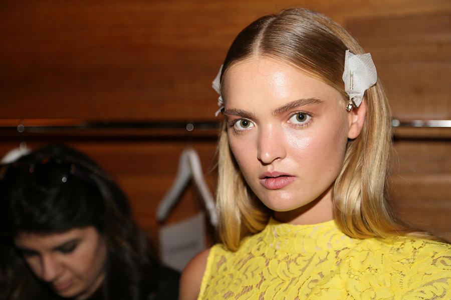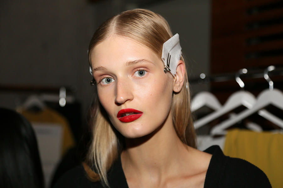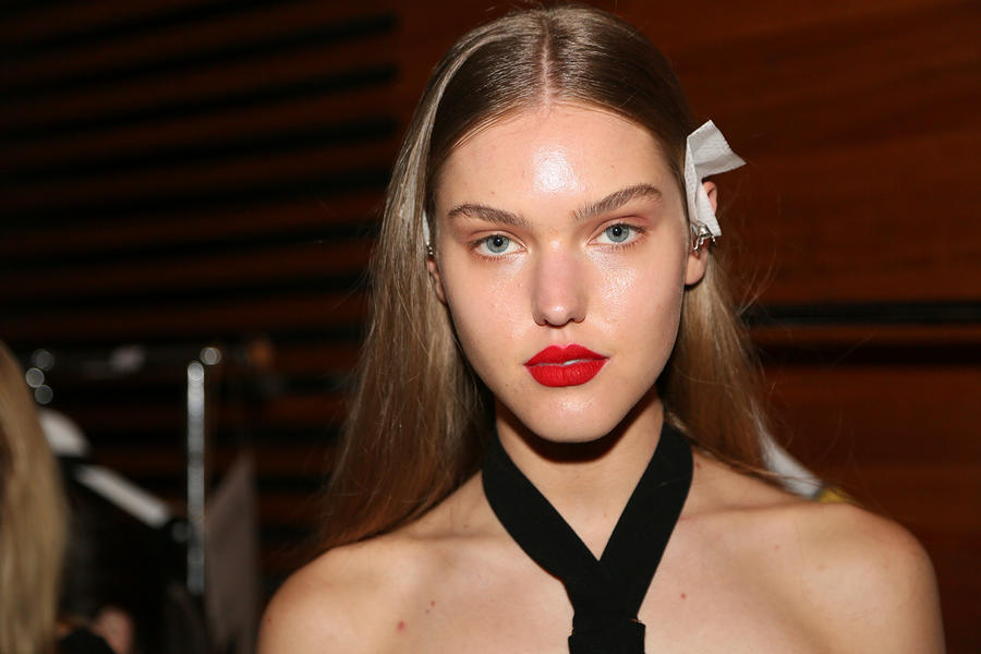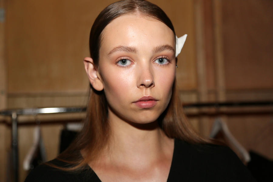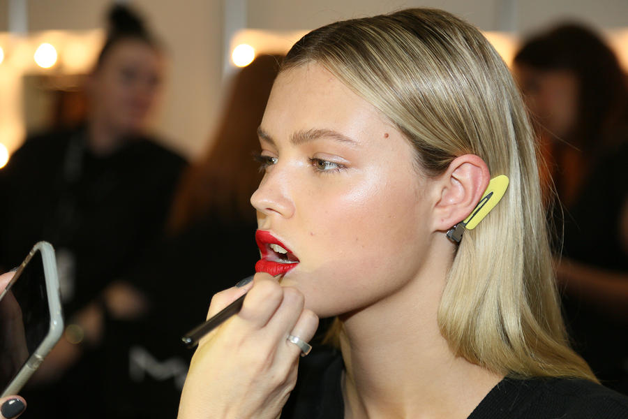 Make-up look: “Rebecca Vallance wanted the make-up to be slightly Palm Springs - so it has that resort feel to it. It's very creamy and very fresh, with the models looking healthy. Some of the girls are having a red lip, and some aren't. We've got a highlight going on using the Lustre Drops in Pink Rebel mixed with Cream Colour Base that gives a golden glow to the skin. That is used on the high planes of the face - so on the cheekbones, down the centre, down the nose, down the cupid's bow. On the eyes, we're using a couple of shades from the M.A.C Trend Forecast Fall 16 Eye Palette. Brows, we've got the Big Brow Pencil brushed slightly through the brow, and then we're brushing them up with Clear Brow Set to keep them in place and lift up the brow - it's not overly drawn on."