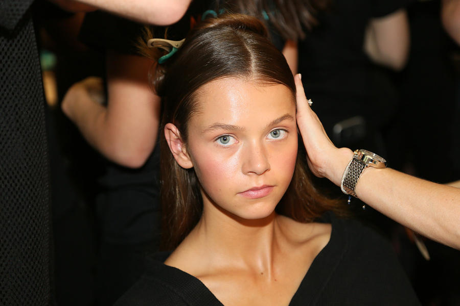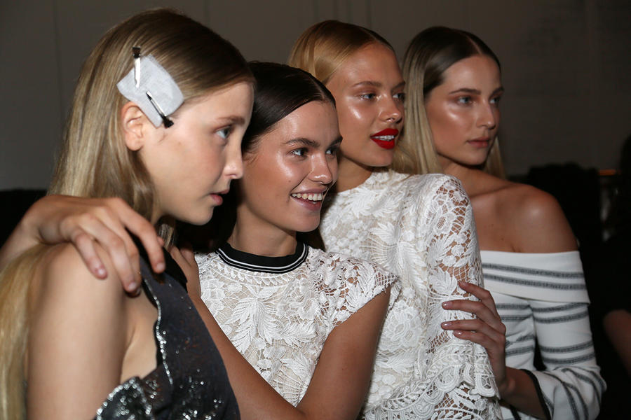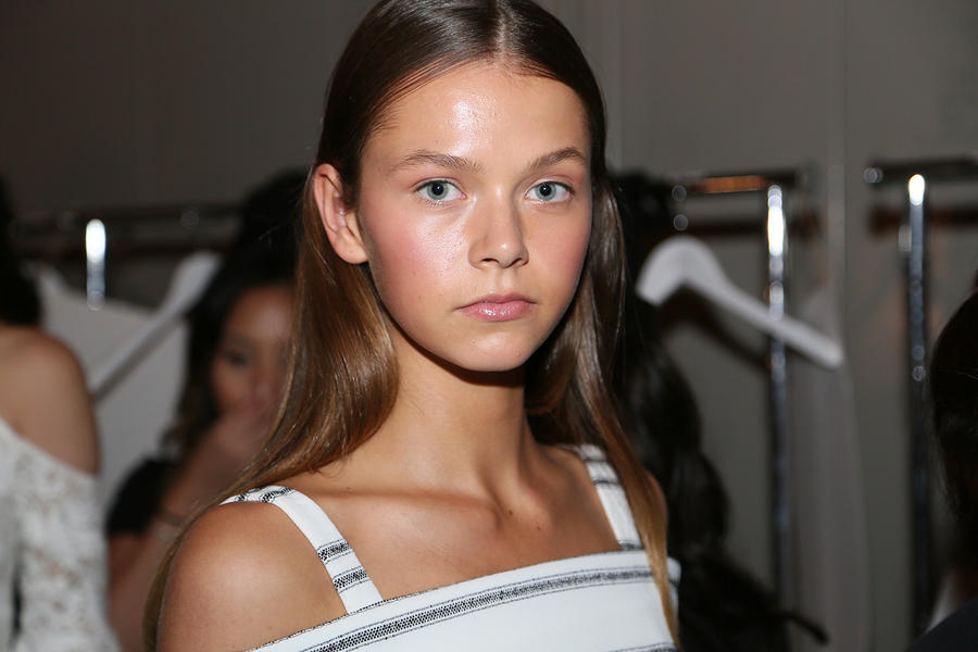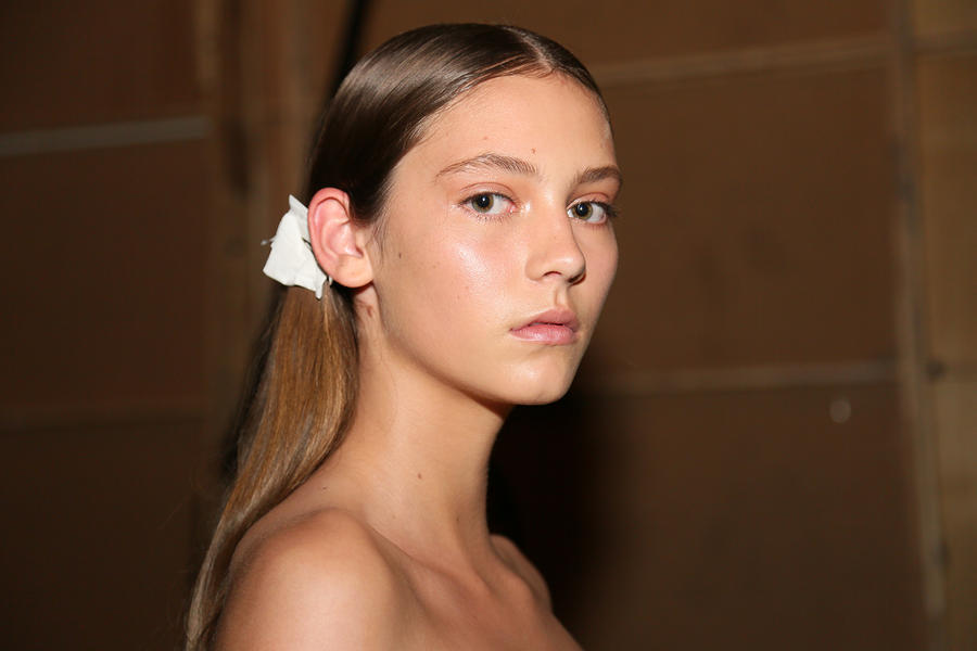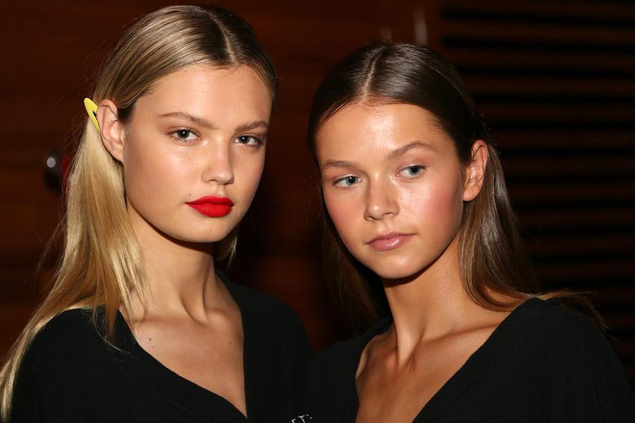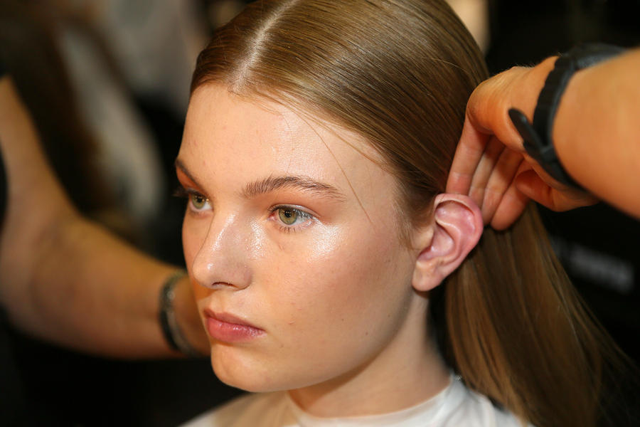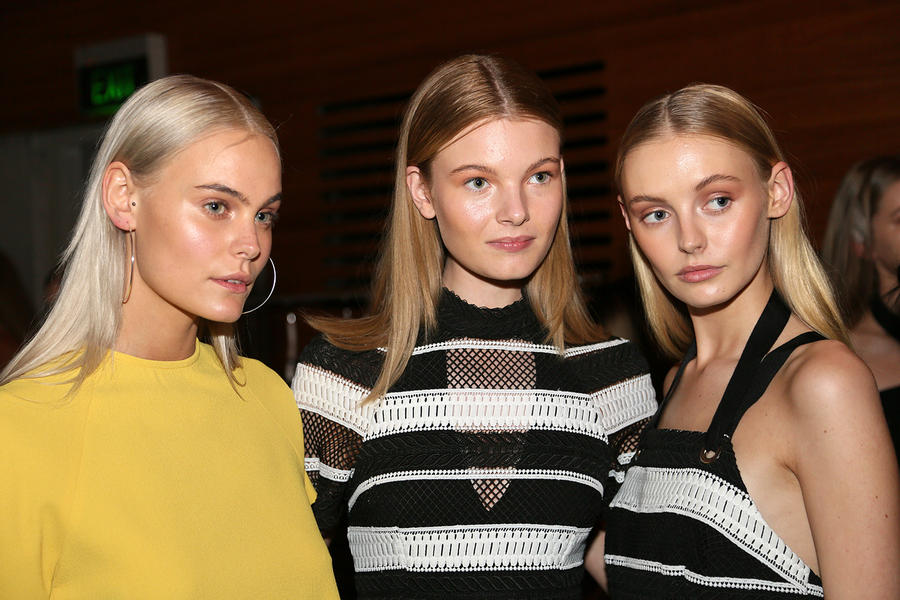 Make-up look: “Rebecca Vallance wanted the make-up to be slightly Palm Springs - so it has that resort feel to it. It's very creamy and very fresh, with the models looking healthy. Some of the girls are having a red lip, and some aren't. We've got a highlight going on using the Lustre Drops in Pink Rebel mixed with Cream Colour Base that gives a golden glow to the skin. That is used on the high planes of the face - so on the cheekbones, down the centre, down the nose, down the cupid's bow. On the eyes, we're using a couple of shades from the M.A.C Trend Forecast Fall 16 Eye Palette. Brows, we've got the Big Brow Pencil brushed slightly through the brow, and then we're brushing them up with Clear Brow Set to keep them in place and lift up the brow - it's not overly drawn on."