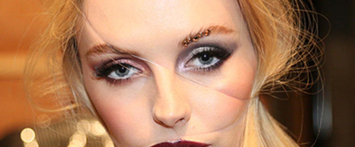 Make-up look: “The make-up look is inspired by Death Becomes Her, so we wanted to create characters - we've got Lady Gaga cross American Horror Story. We're giving the models two different eyes, two different highlights, two different everything so we have a beautiful Frankenstein. We're giving them a velvet base with Maybelline New York Dream Velvet Foundation, a dark berry lip and then glitter to highlight points on the face. We also have maximum eyelashes and a maximum smokey eye. After that, we're going to use a nylon thread around the face to give a Frankenstein appearance. Brows are very important in this and we're giving them a full almost ombre brow with stones added for drama. Lips have a vampy finish."