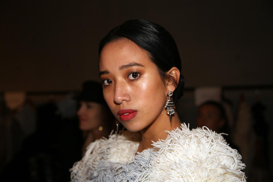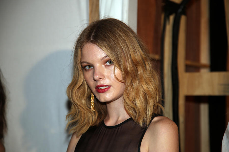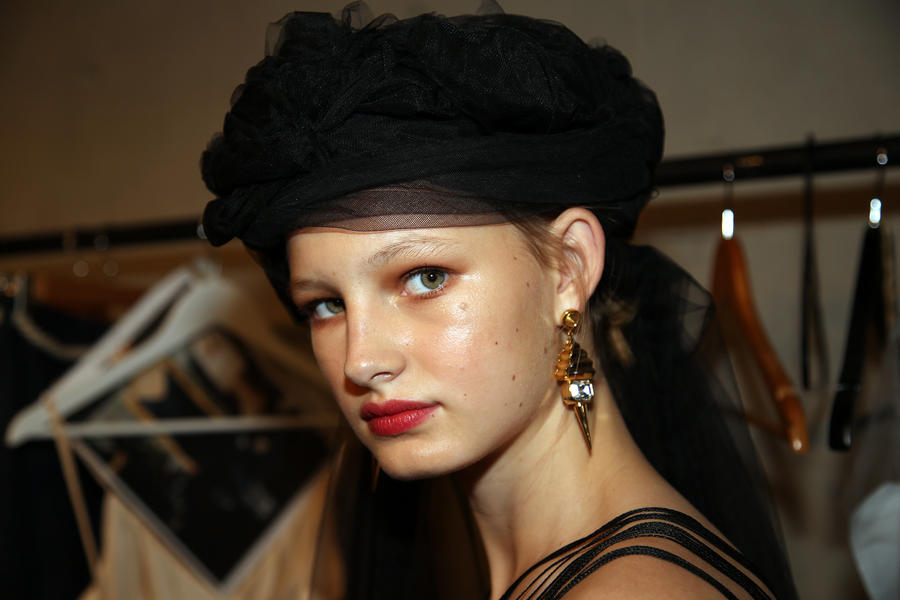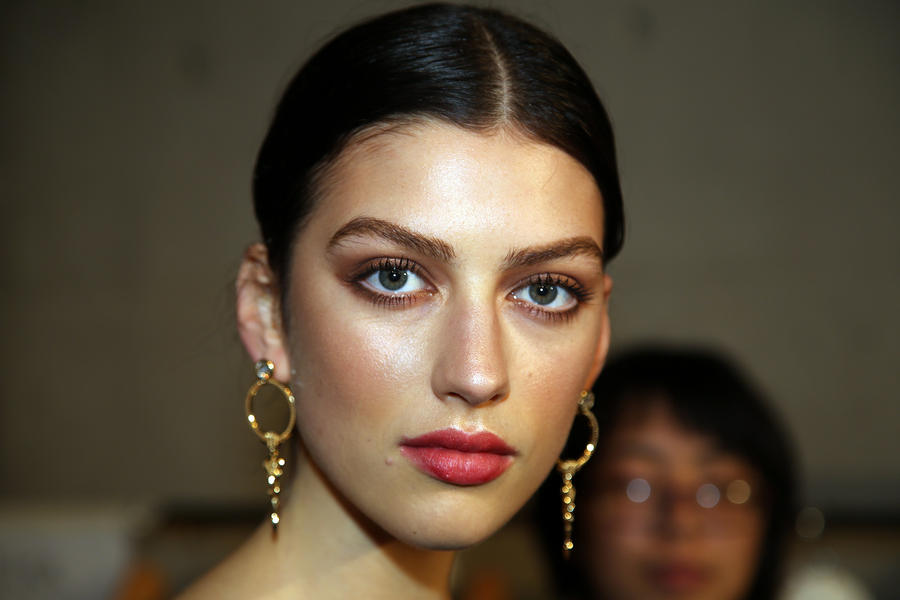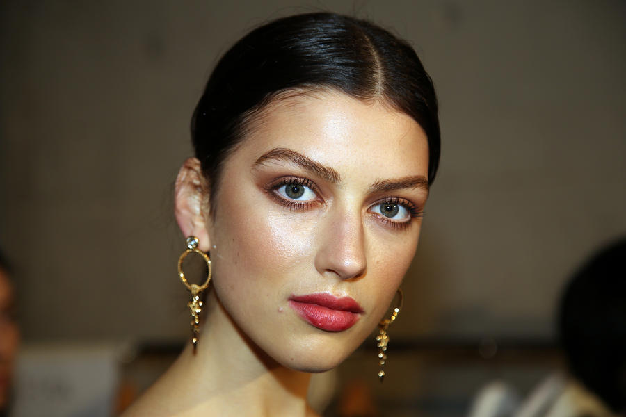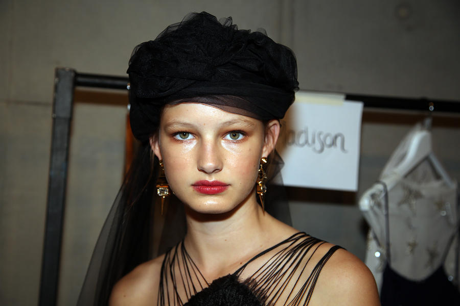 “The look is a little bit rustic. A lot of work has been done with just blending in and moulding with fingers and everything is a little blown out. There are no harsh lines. We’ve done a really beautiful coppery-smokey, medium intensity eye. For this we’ve used Napoleon Perdis Colour Disc Eye Shadow in Copper Topper and to round the lash line for a bit of definition we’ve used Napoleon Perdis Mesmer-Eyes Mascara which is really rich and thick. We’ve used three coats on top and one on the lower lashes. Around that we’ve used the Napoloeon Perdis Brown Sugar Pencil but really fused out. On the cheeks we’ve used one of our new Napoleon Perdis Miss Jean Lipsticks in MJ 10 and on lips we’ve gone for a rosy stain using the Napoleon Perdis Mattetastic Lipstick in Marlena which is the fused out with the fingertips. The skin has been left bare on most of the models but we made sure it looked really hydrated and luminous on all the high points of the face.”