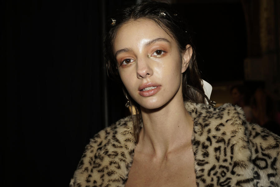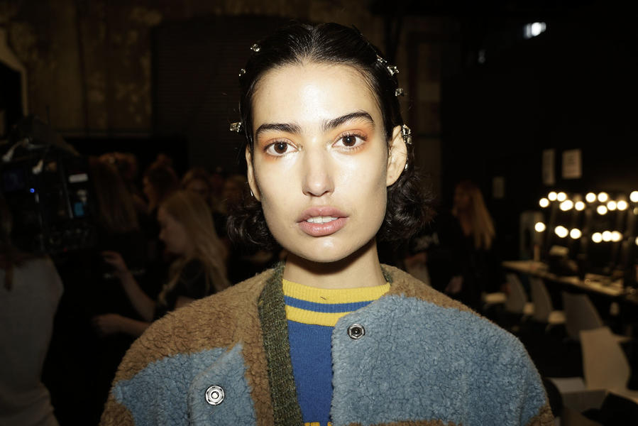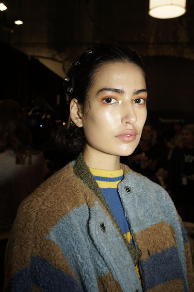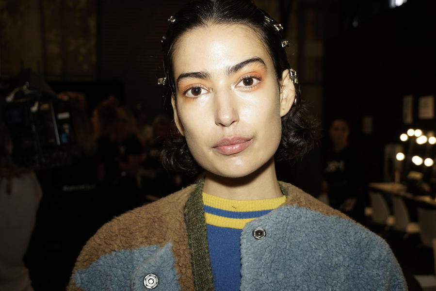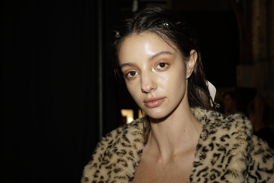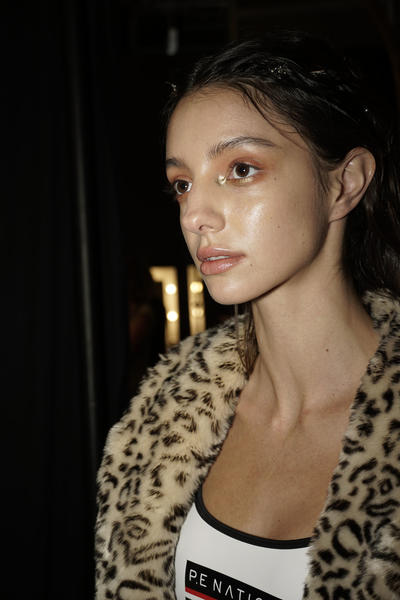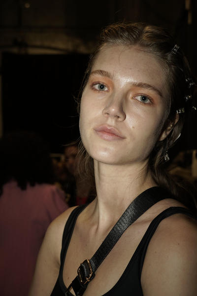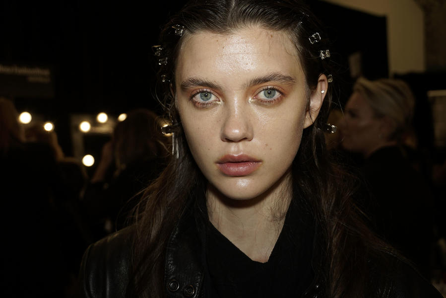 “The girls are fresh-faced and organic. There's nothing contrived about this look. We've used an amazing new lipstick called Smoke Almond on the eye as well as the lips, as a stain. We're also giving the girls a touch of armour with a glint of gold. This gives the look strength and power. For that we've used a gold MAC Pigment with a Mixing Medium Eyeliner and we've come back in with a little cotton bud to give the gold more movement.