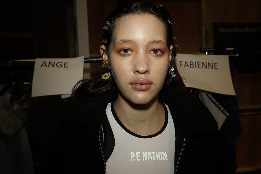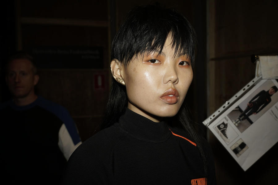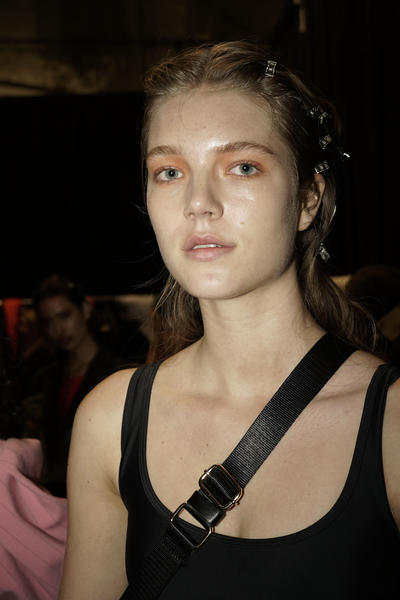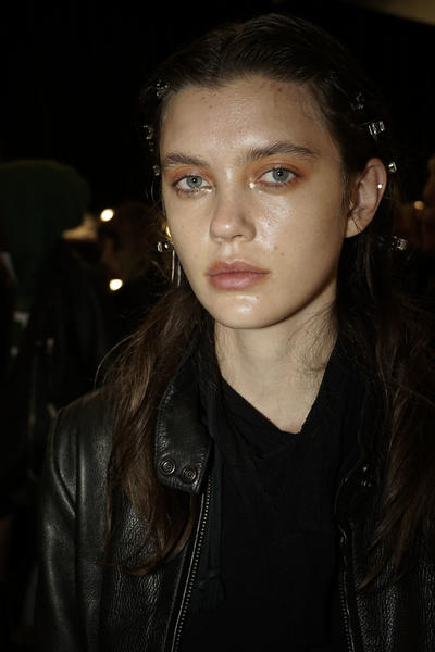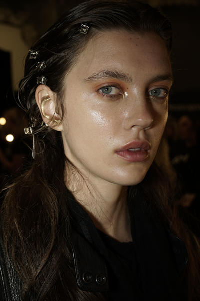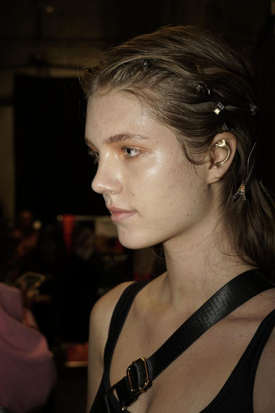 "It's a cool girl texture. We're working with middle parts but making sure that the girls natural hair texture is kept as it is. There's waves, curls and layers and roots that are tight against the scalp, that we've created with O&M products. The Atonic Thickening Spritz has been used to create a wet look but with moveability. Contrasting this, we've used a new product, Desert Dry on the middle and ends to give a fly away finish. Depending on the girl, we might also add some serum on the ends to define the look."