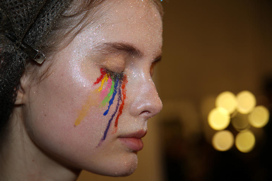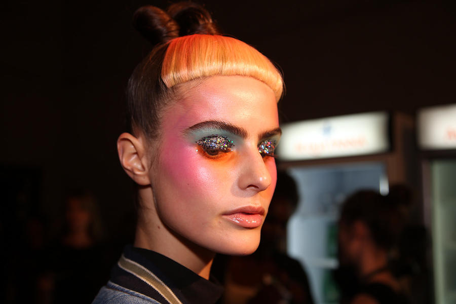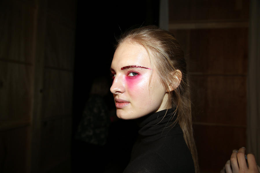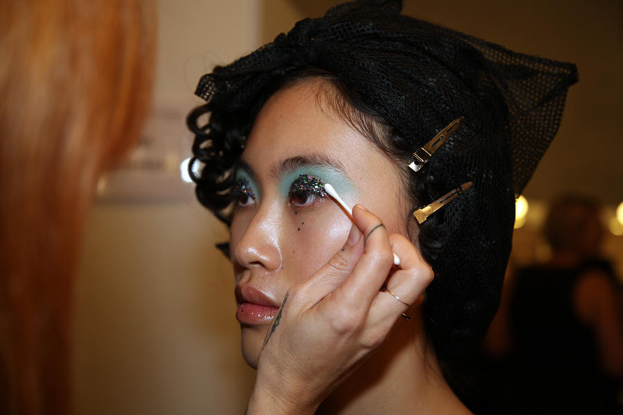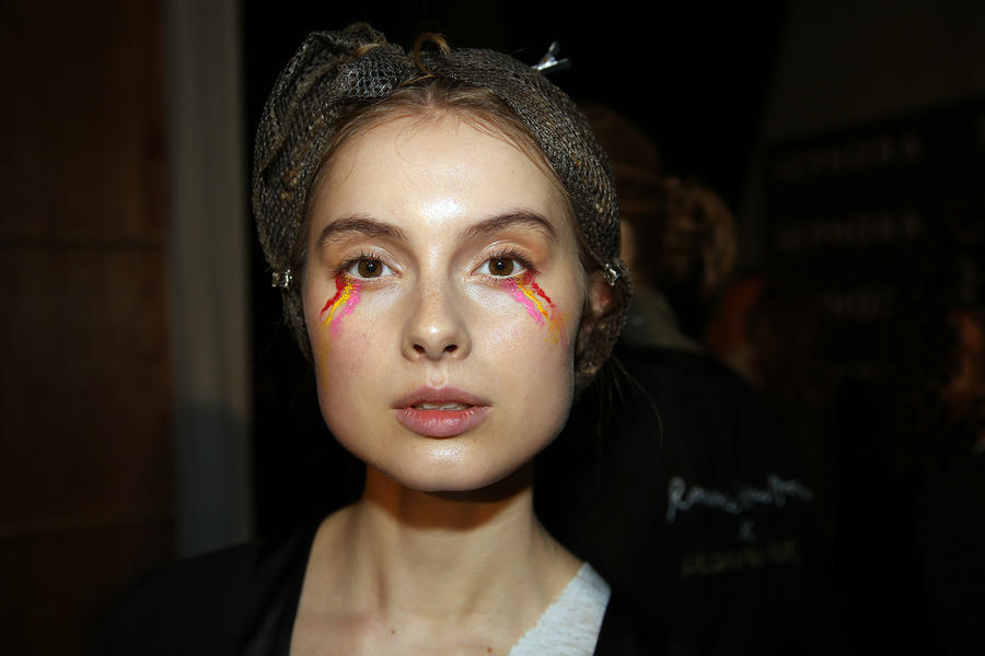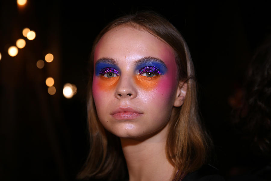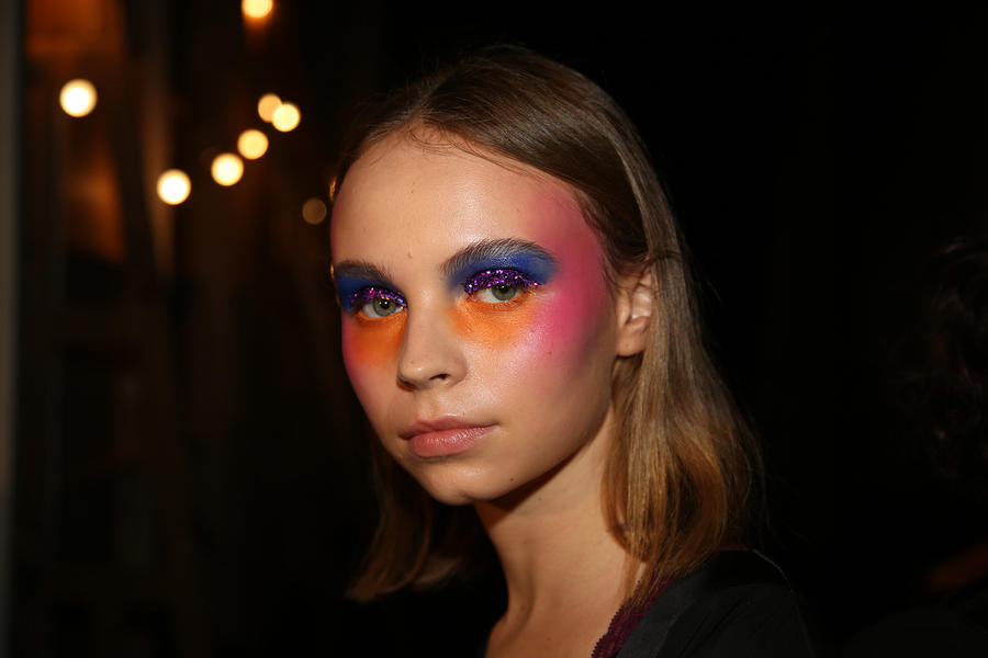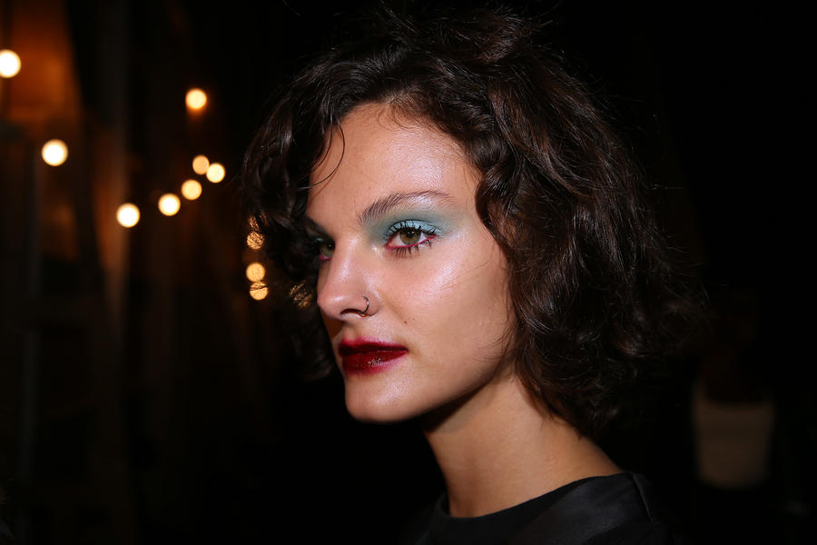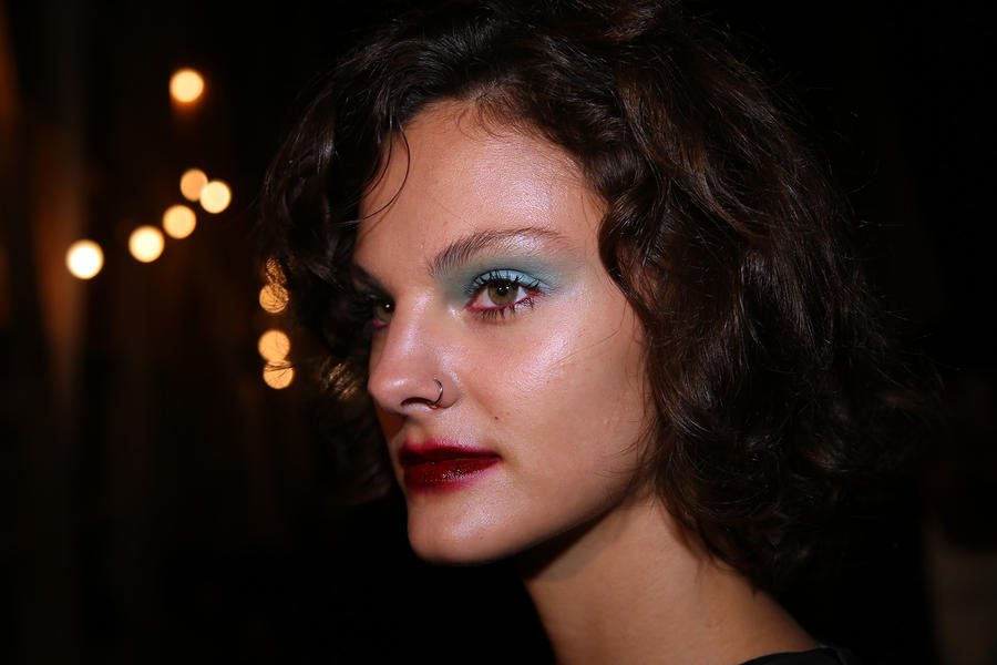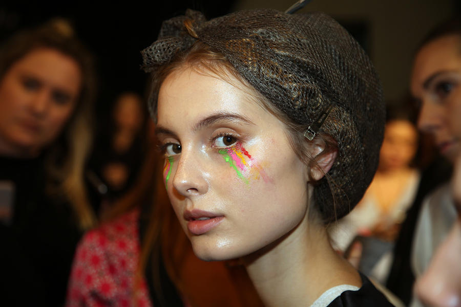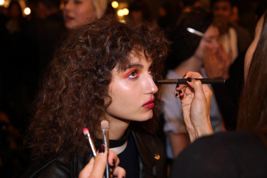 “Romance’s reference and inspiration came from the paintings of Del Kathryn Barton, the artist they’ve collaborated with, Daphne Guinness and Grimes. So we’ve created all of these characters and women based loosely around these muses. There’s a lot of colour going on, and a lot of glitter - it wouldn’t be a Romance show without a lot of glitter. Some of the girls will be cooler rock n’ roll girls so we’ve gone a little darker and edgier on those. We’ve also got more of a polished version which is really glossy makeup, there’s very glossy lips which look like they’ve been kissed all night so the lip line is slightly blurred outside the natural line, it’s very soft looking but with a really hard gloss over the top. Once we worked out what type of looks we wanted to do, we sat down and tweaked every makeup style to the outfit and we’ve used colours that have been picked out of the actual clothes. Everything is quite bespoke even though there’s only five makeup looks and 30 girls. All the products have come from SEPHORA, we’ve used a lot of lip liners, eye liners and a lot of the brightly coloured eye shadows and lots of their chunky mascara. We’ve also used very light bases, we’re using a very iridescent like texture on the skin, just a sheen and then concealer. We wanted the skin to have realness and coolness to avoid things looking too theatrical.”