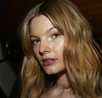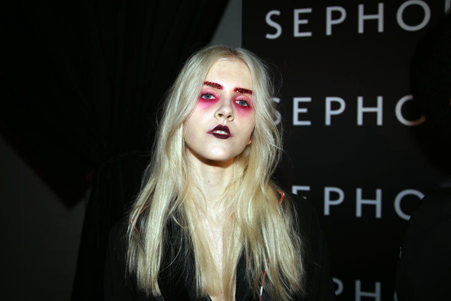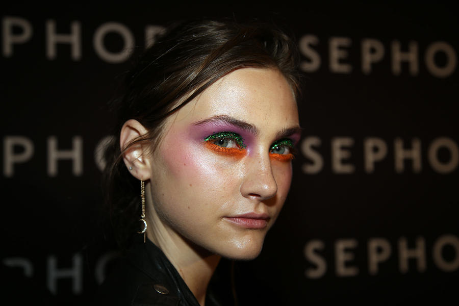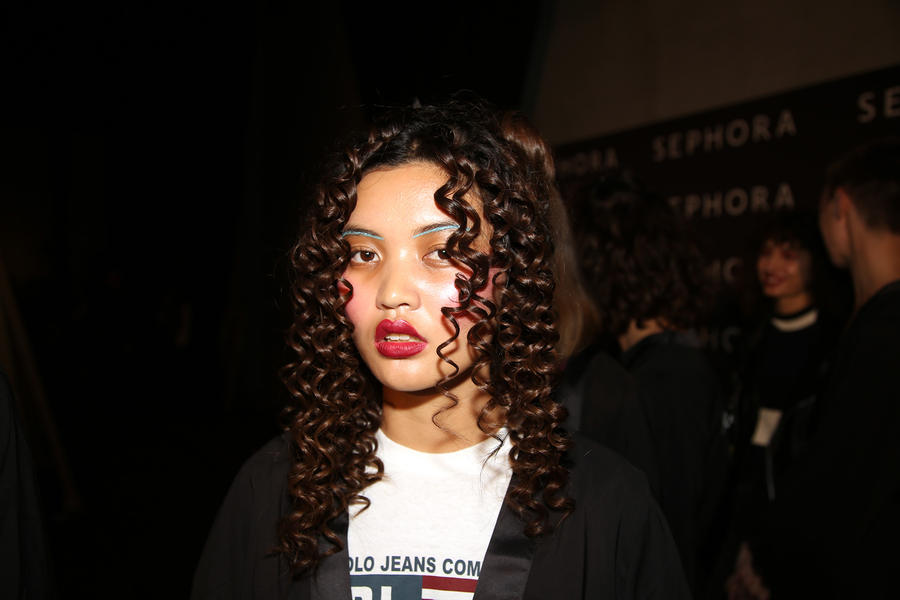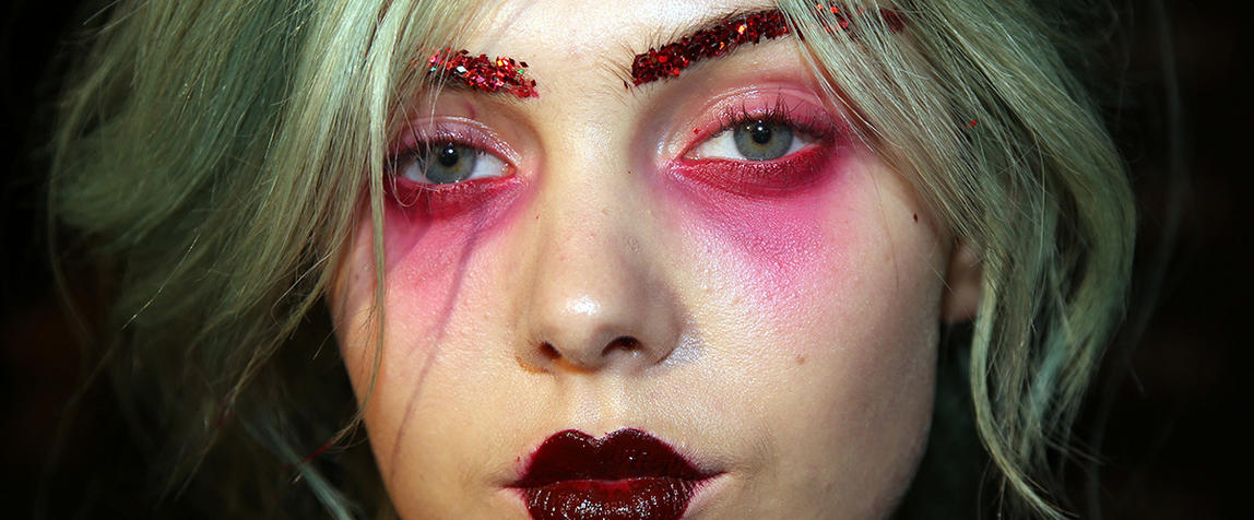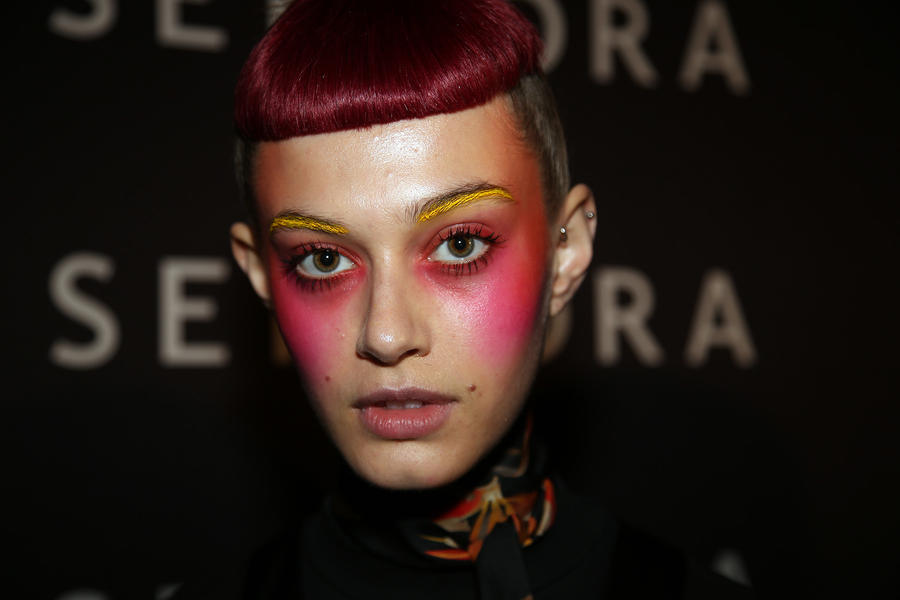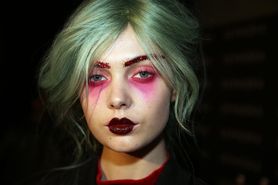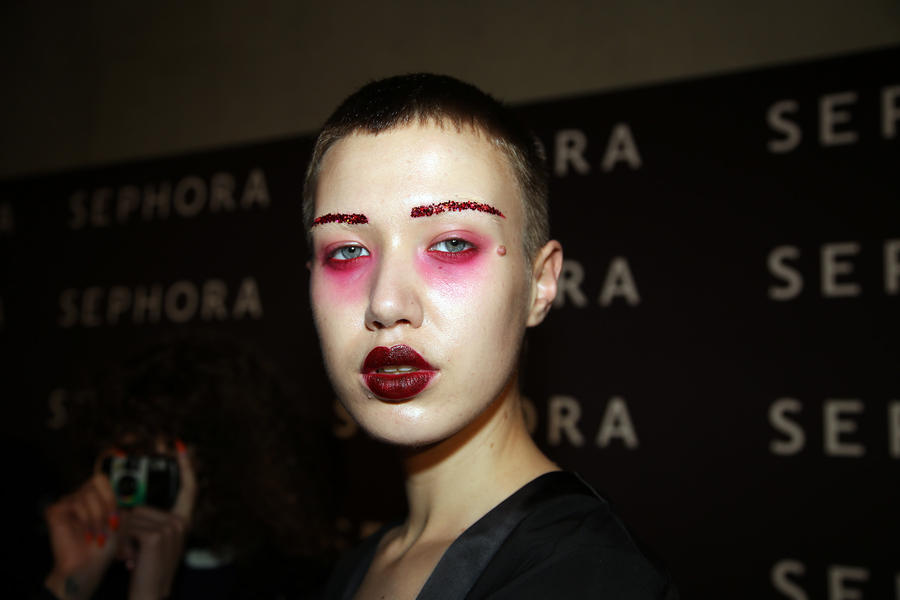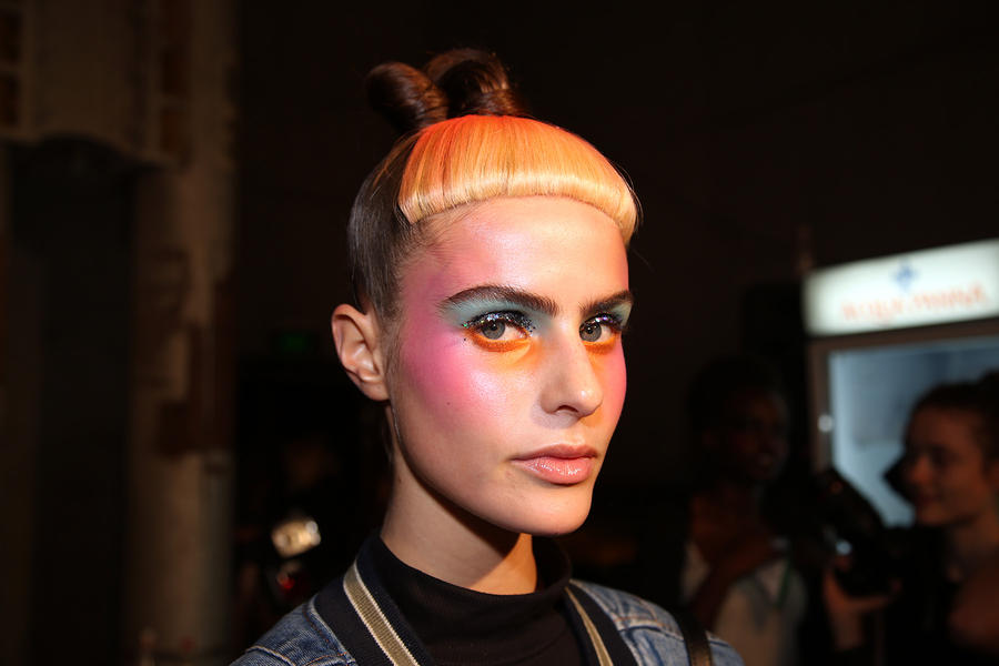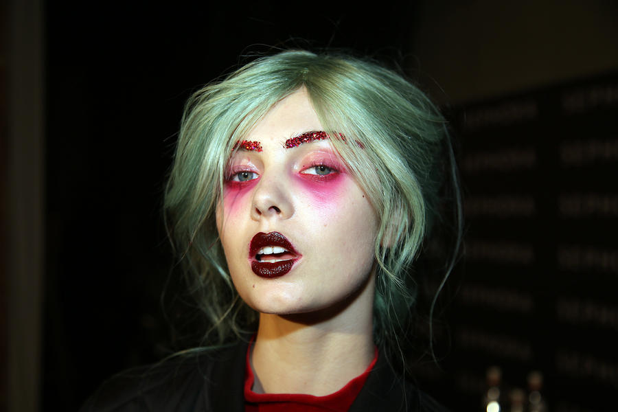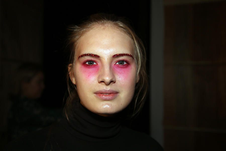 “Romance’s reference and inspiration came from the paintings of Del Kathryn Barton, the artist they’ve collaborated with, Daphne Guinness and Grimes. So we’ve created all of these characters and women based loosely around these muses. There’s a lot of colour going on, and a lot of glitter - it wouldn’t be a Romance show without a lot of glitter. Some of the girls will be cooler rock n’ roll girls so we’ve gone a little darker and edgier on those. We’ve also got more of a polished version which is really glossy makeup, there’s very glossy lips which look like they’ve been kissed all night so the lip line is slightly blurred outside the natural line, it’s very soft looking but with a really hard gloss over the top. Once we worked out what type of looks we wanted to do, we sat down and tweaked every makeup style to the outfit and we’ve used colours that have been picked out of the actual clothes. Everything is quite bespoke even though there’s only five makeup looks and 30 girls. All the products have come from SEPHORA, we’ve used a lot of lip liners, eye liners and a lot of the brightly coloured eye shadows and lots of their chunky mascara. We’ve also used very light bases, we’re using a very iridescent like texture on the skin, just a sheen and then concealer. We wanted the skin to have realness and coolness to avoid things looking too theatrical.”