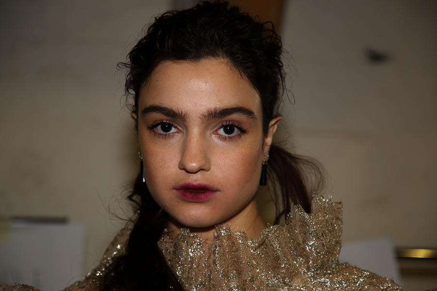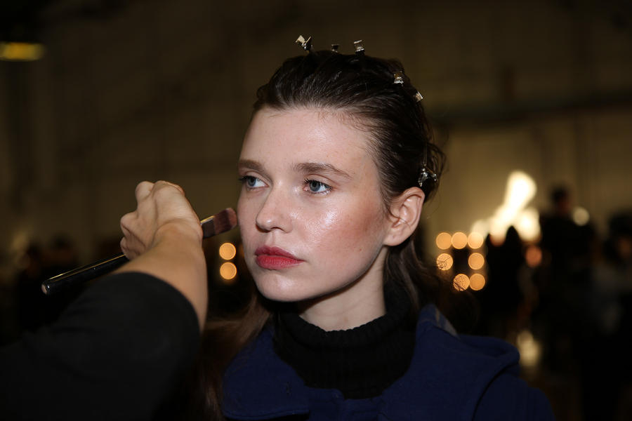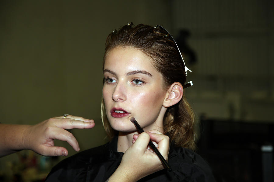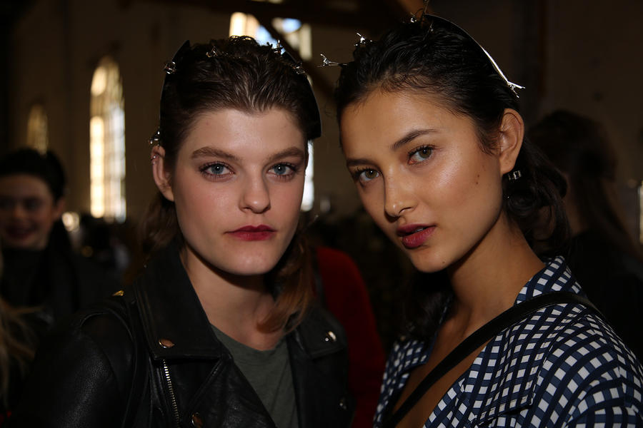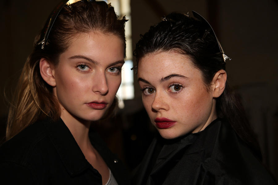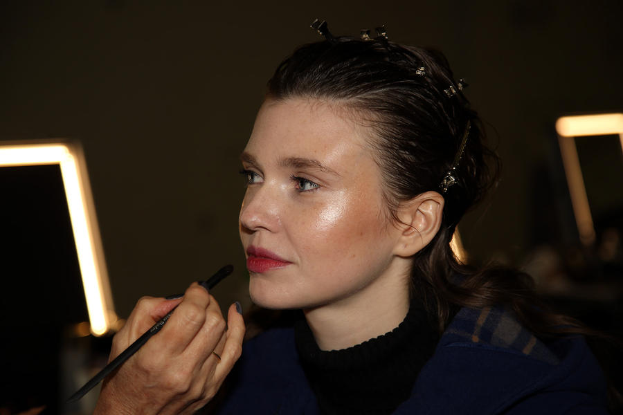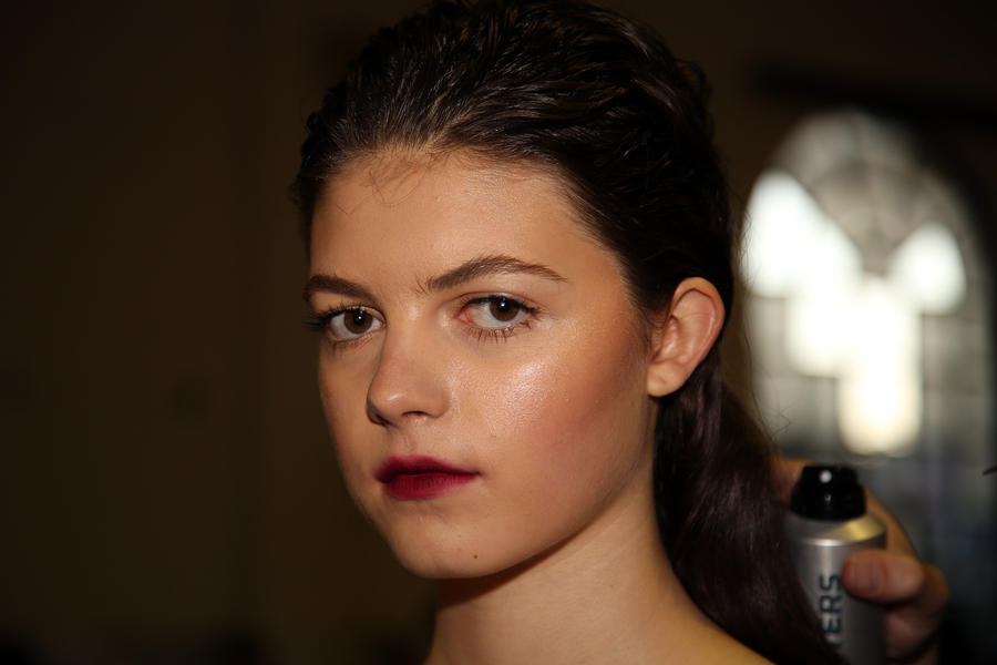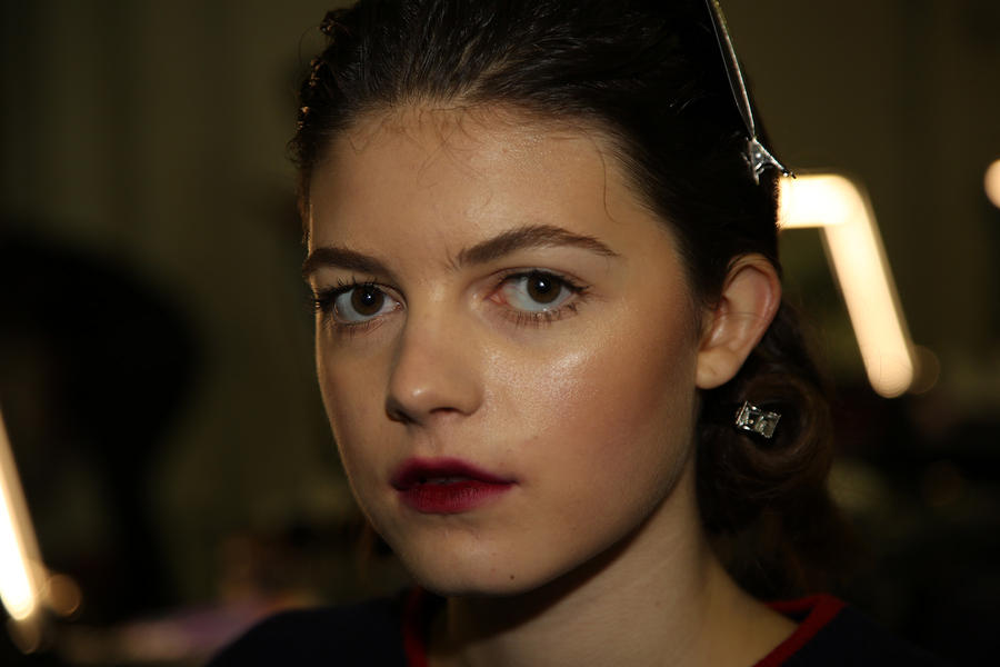 “The look is all about the cool modern girl trapped in an old baroque traditional world. This is replicated on the face very much so because the lip is almost Elizabethan, it’s a stain, it’s quite painterly put on and it’s a beautiful rich berry tone which is symbolic of that time. The skin is super modern, really drawn back with a natural matte finish and the brow is lighter, really groomed and brushed out. The girl loves mascara so we’ve gone to town on the top lash line and that’s really her only definition, kind of like a cool Parisienne club girl. Then we’ve done a cream cheek with a pop of gloss.”