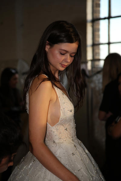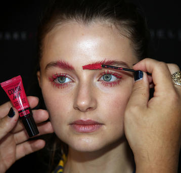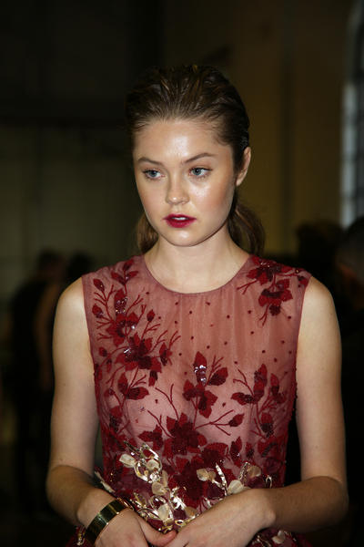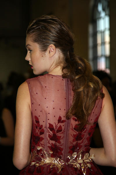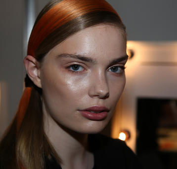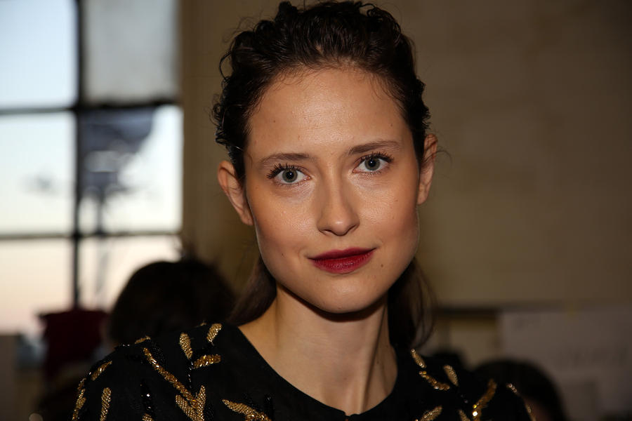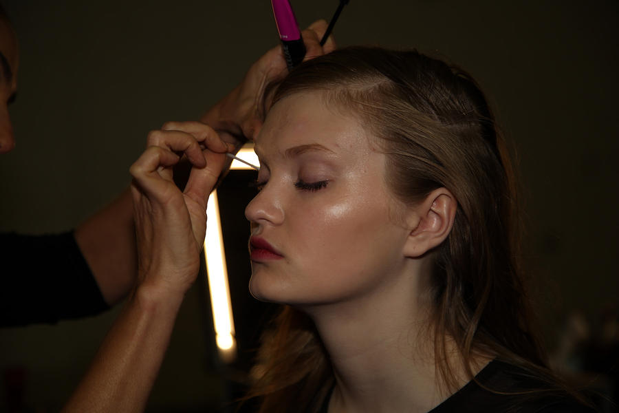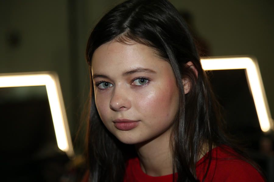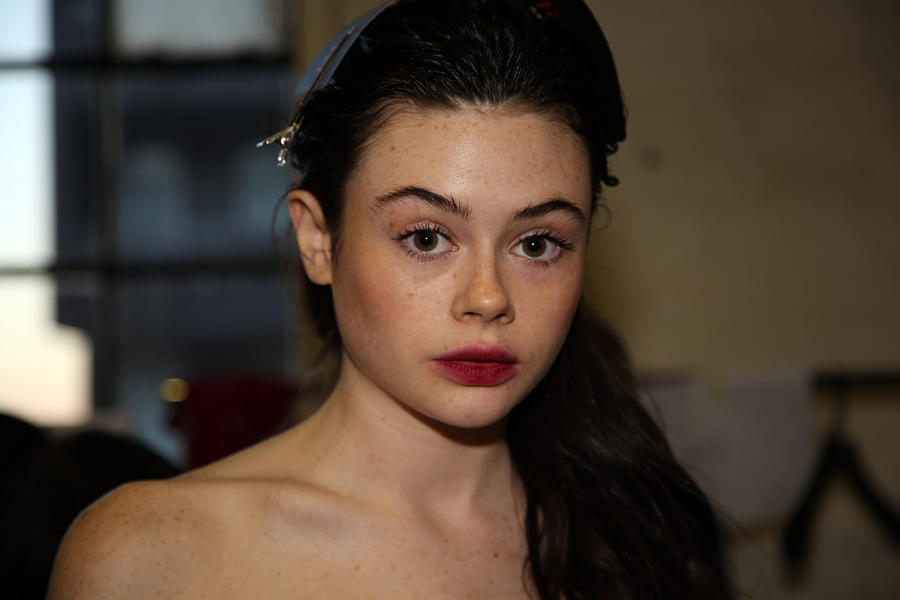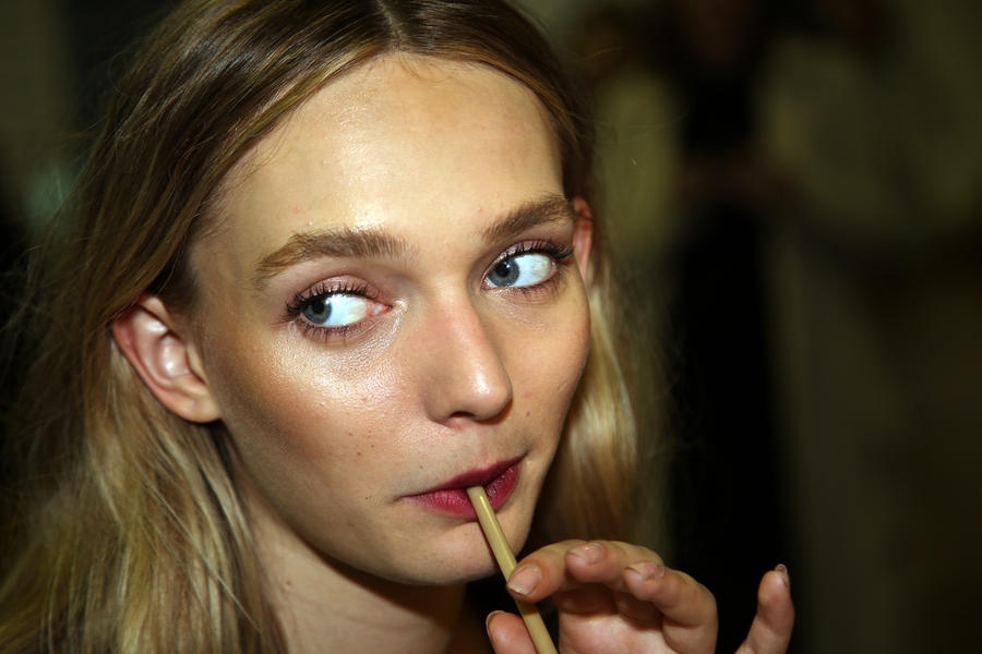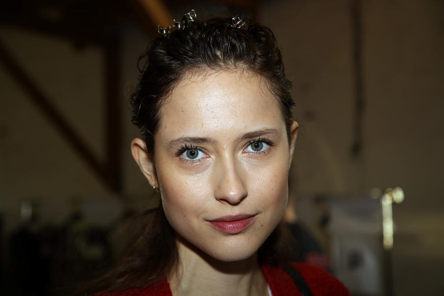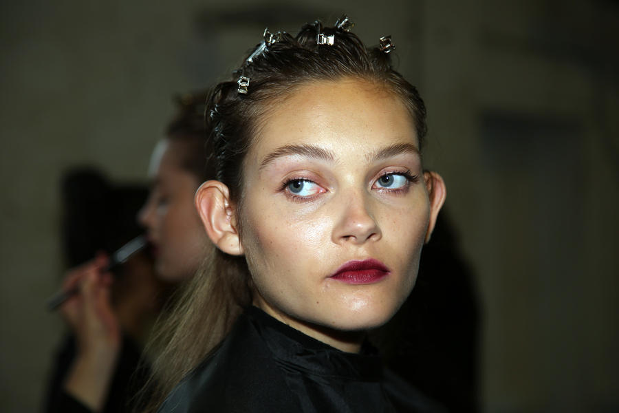 “The look is all about the cool modern girl trapped in an old baroque traditional world. This is replicated on the face very much so because the lip is almost Elizabethan, it’s a stain, it’s quite painterly put on and it’s a beautiful rich berry tone which is symbolic of that time. The skin is super modern, really drawn back with a natural matte finish and the brow is lighter, really groomed and brushed out. The girl loves mascara so we’ve gone to town on the top lash line and that’s really her only definition, kind of like a cool Parisienne club girl. Then we’ve done a cream cheek with a pop of gloss.”