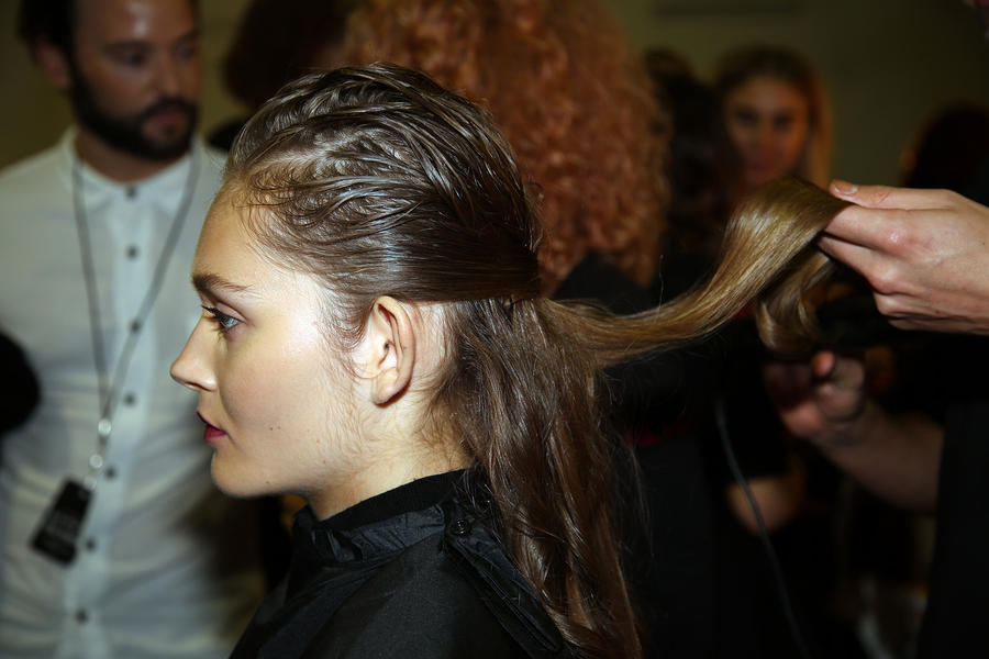 “The woman in mind is quietly confident, she’s a sophisticated woman and is aware of her surroundings, the hair we have created reflects her personality. It’s destroyed and oozes wealth. We have pulled it back using fingers and on damp hair used the Revlon Style Masters Modular Styling Mousse 2 and blow dried it all in. On fine hair this works wonders beacuse it gives a texture that is really gritty. We then grabbed the defining Revlon Professional Style Masters Creator Defining Gel and worked that through the top half of the hair, very loosely to create the destroyed look. To keep the hair looking modern and chic, we’ve kept the mid lengths and ends tight to the head. We wound the sections vertically because we wanted the mane to stay long and tight to the head - we did this because we didn’t want volume, we wanted the ends to hug the nape of the neck. If the hair needed more shine to it we used the Revlon Professional Style Masters Shine Spray Glamourama 0 but kept it quite light on product.”