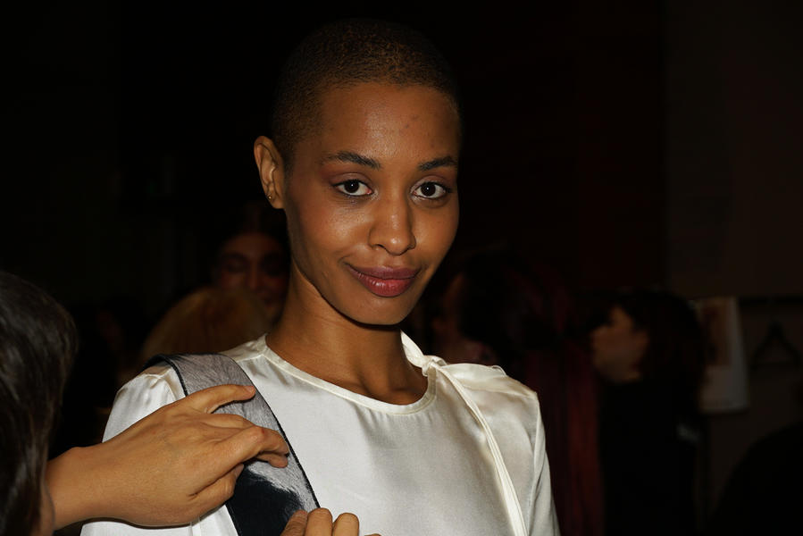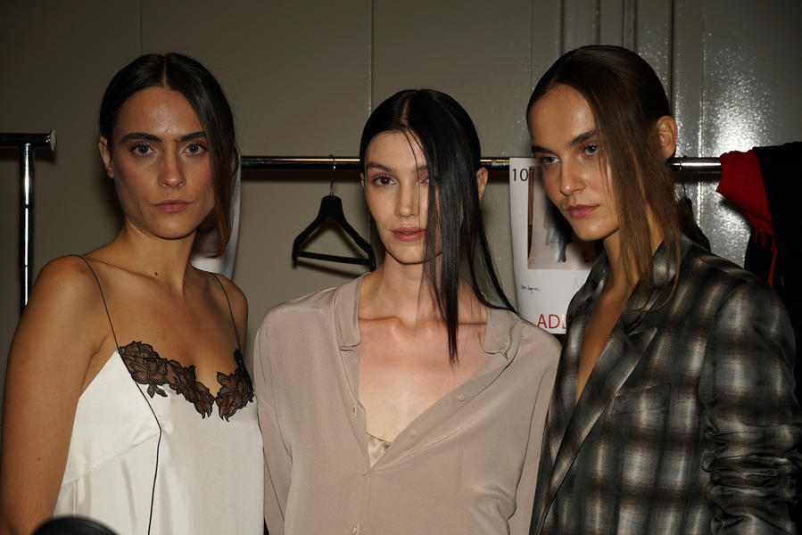 “The inspiration was a cool girl just out of the shower and she’s thrown her hair into a knot herself – leaving one effortless bit hanging down to be a bit ethereal to match Thomas’ clothing. It’s very feminine, pretty and not too done. The hero products that we’ve used are Sebastian Professional Dark Oil, Trilliance Spray and Shaper Hairspray.”