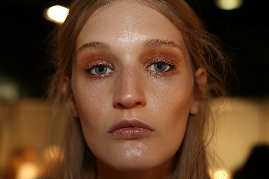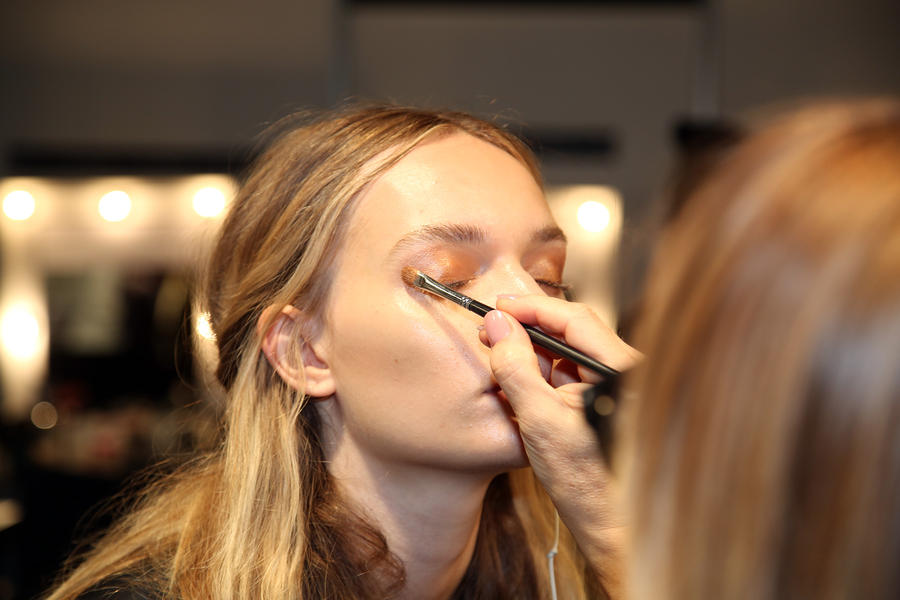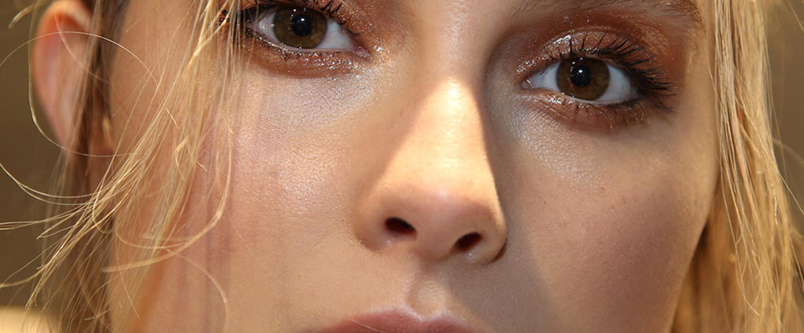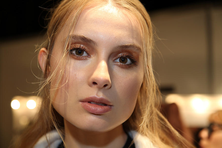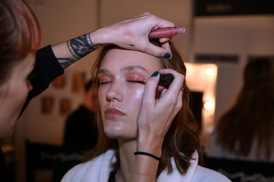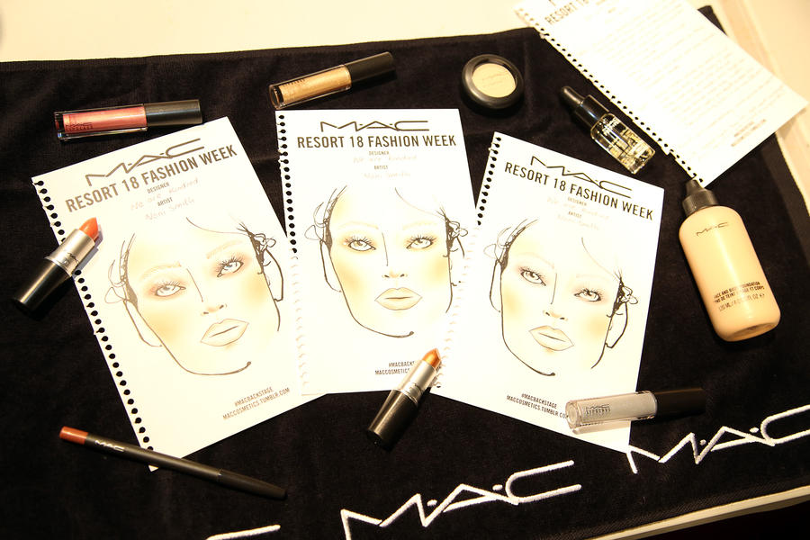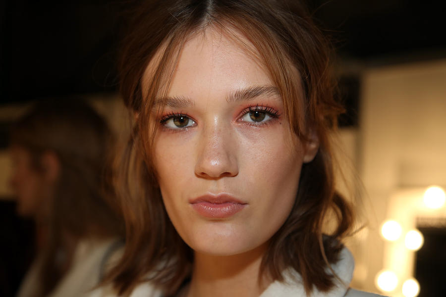 “The look is really beautiful, glossy, glowy and luminous. We’re using lipstick on the eye, with lip gloss over the top. While this might not be entirely comfortable to wear, it looks amazing! On the skin we’ve used M.A.C Lightful Softening Lotion which gets rid of any dryness and makes sure there’s a beautiful even surface for the makeup. We’ve also used M.A.C Prep + Prime Essential Oil and M.A.C Face and Body Foundation which has a lovely sheeny-glow to it. So that’s three layers of luminosity. For the eyes we chose three colours that compliment the fabrics in the collection. There’s a peachy-pink, a golden bronze and a lilac - all of them are very iridescent - and with the lipstick, this creates a very pearlescent look. Brows are really brushed up with M.A.C Brow Set, we love this and can’t get enough of it, then we’ve lightly filled in the gaps. We’ve curled the lashes, used mascara on just the top lashes, and to give a little bit of intensity to the eye area, we’ve run a dark, dark brown pencil along the water line and then rubbed it off with a cotton tip. This means the pencil sticks on the lashes and gives a bit of extra definition. The lip is matte which is a contrast to the eye and we’ve used a white pencil on the cupid's bow to make it pop. The look is finished with M.A.C Mineralize Skinfinish in Soft & Gentle on the high planes of the face, its got a bit of apricot in it to tie everything together.”