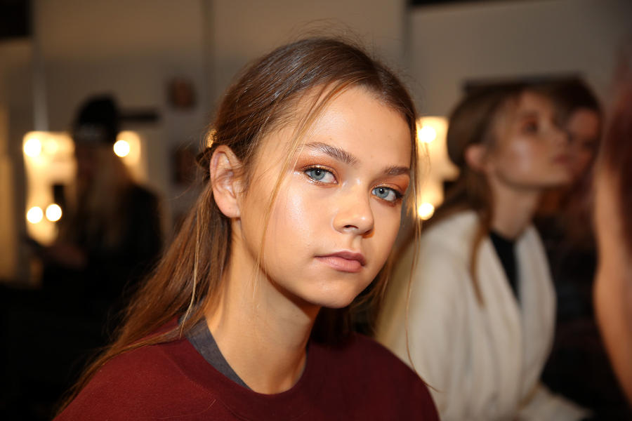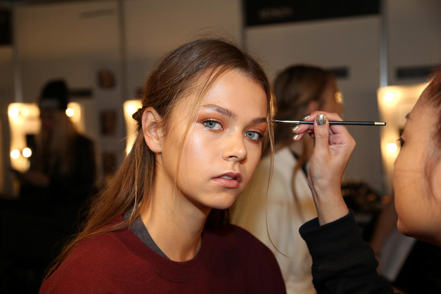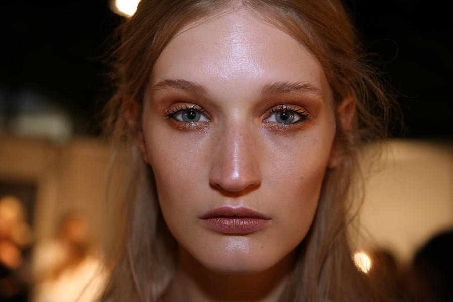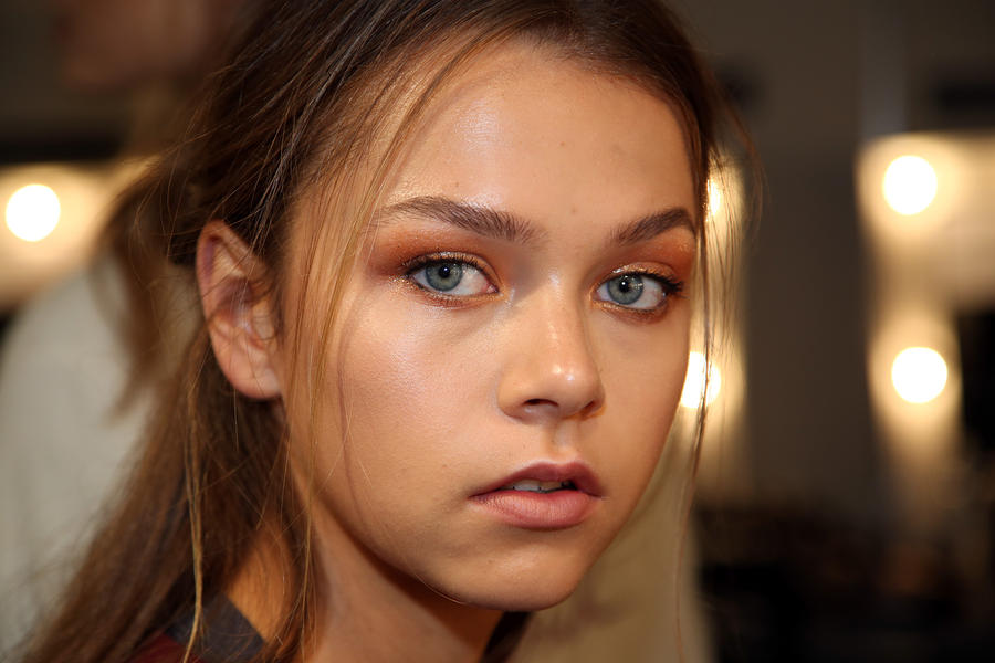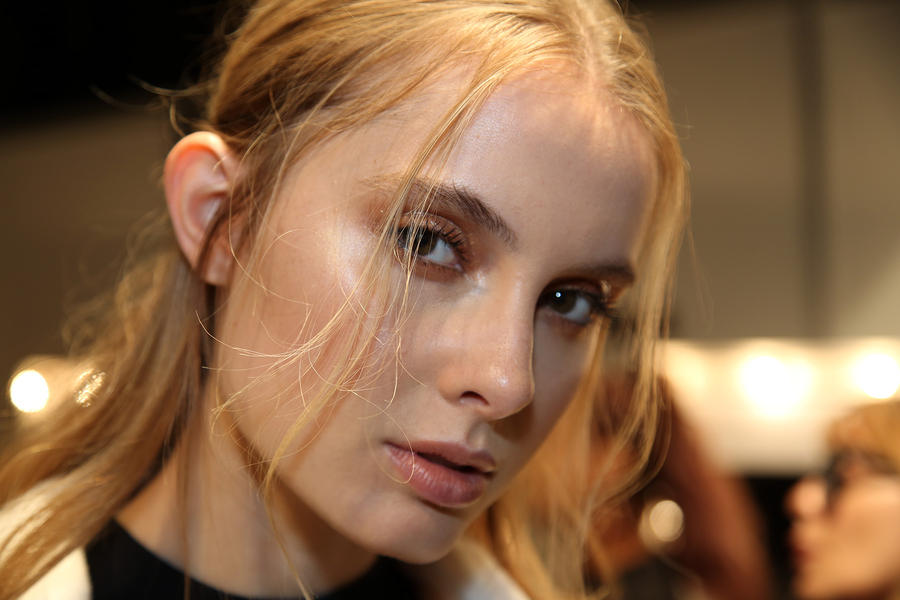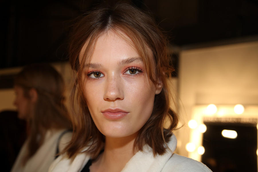 “The look is really beautiful, glossy, glowy and luminous. We’re using lipstick on the eye, with lip gloss over the top. While this might not be entirely comfortable to wear, it looks amazing! On the skin we’ve used M.A.C Lightful Softening Lotion which gets rid of any dryness and makes sure there’s a beautiful even surface for the makeup. We’ve also used M.A.C Prep + Prime Essential Oil and M.A.C Face and Body Foundation which has a lovely sheeny-glow to it. So that’s three layers of luminosity. For the eyes we chose three colours that compliment the fabrics in the collection. There’s a peachy-pink, a golden bronze and a lilac - all of them are very iridescent - and with the lipstick, this creates a very pearlescent look. Brows are really brushed up with M.A.C Brow Set, we love this and can’t get enough of it, then we’ve lightly filled in the gaps. We’ve curled the lashes, used mascara on just the top lashes, and to give a little bit of intensity to the eye area, we’ve run a dark, dark brown pencil along the water line and then rubbed it off with a cotton tip. This means the pencil sticks on the lashes and gives a bit of extra definition. The lip is matte which is a contrast to the eye and we’ve used a white pencil on the cupid's bow to make it pop. The look is finished with M.A.C Mineralize Skinfinish in Soft & Gentle on the high planes of the face, its got a bit of apricot in it to tie everything together.”