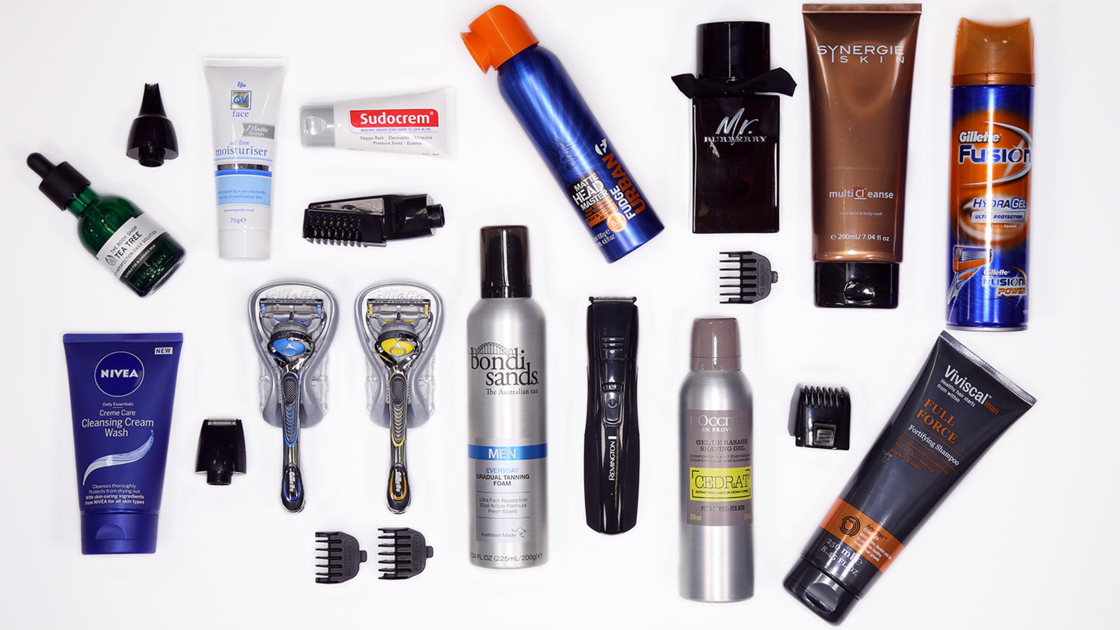 Here, we've included the classics (i.e. Sudocrem, Gilette and tea tree oil) as well as some newcomers to men's grooming, like Bondi Sands' Everyday Gradual Tanning Foam for men - the same formula sans the feminine fake tan smell.