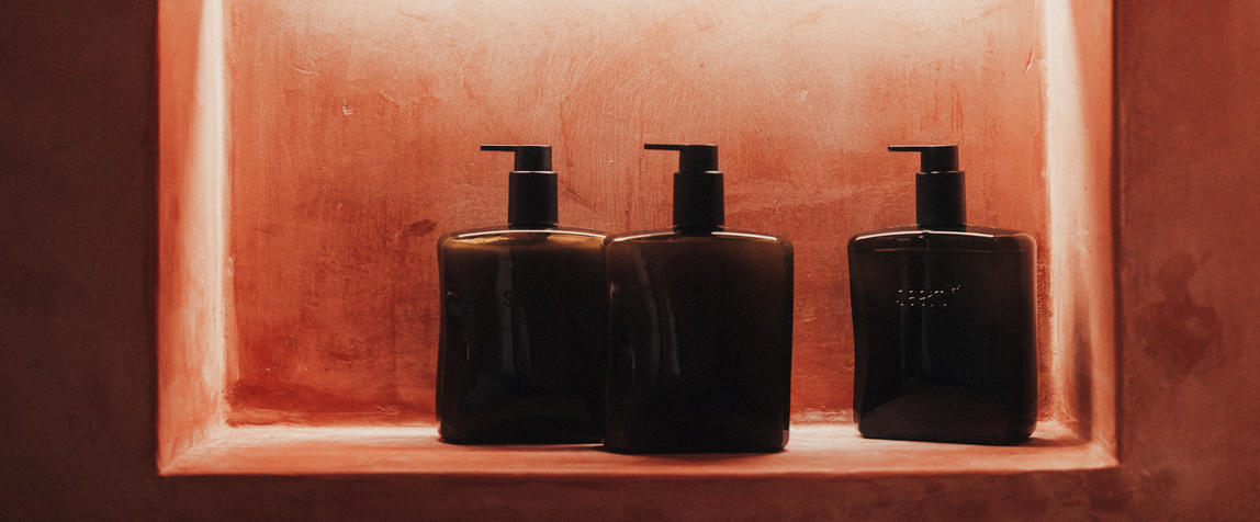 Both are housed in amber bottles with a pump, for modern functionality and elevated presence on any bathroom shelf.