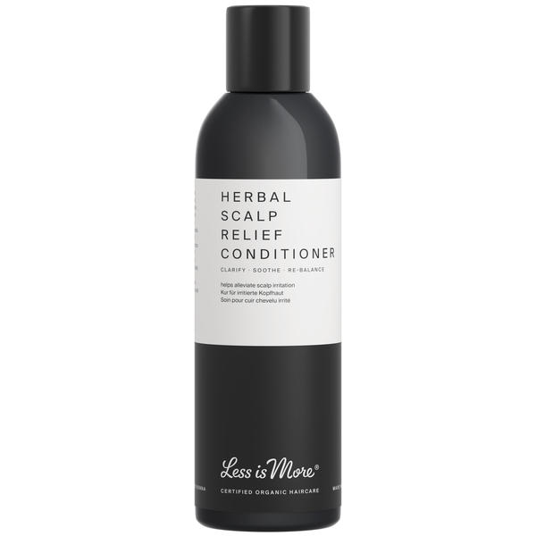 Less is More Herbal Scalp Relief Conditioner is a conditioner that clarifies, soothes, rebalances and helps alleviate scalp irritation. It features a bio-active care complex that helps normalise the scalp function. White clay (kaolin) is rich with minerals, working to cleanse and reduce inflammation, giving fine hair volume. Hemp seed oil (virgin plant oil cold-pressed) is rich with omega-3 and omega-6 fatty acids and is highly anti-inflammatory and regenerative. Forest honey from natural reserves also adds moisture, nourishes and cares for hair and scalp.