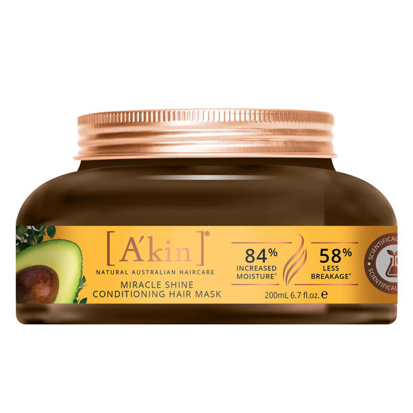 A'kin Miracle Shine Conditioning Hair Mask is a conditioning hair mask that helps to lock in moisture and restore softness and shine with essential vitamins and natural essential oils. After becoming the number one natural treatment product in pharmacy* and frequently selling out in sachet form, A'kin launched its Miracle Shine Conditioning Hair Mask in a 200mL jar. Providing luxurious hydration to dry, damaged hair, the mask is scientifically proven to increase moisture by 84% thanks to Australian avocado, jojoba and sandalwood oils, leaving your locks looking and feeling healthy, naturally.