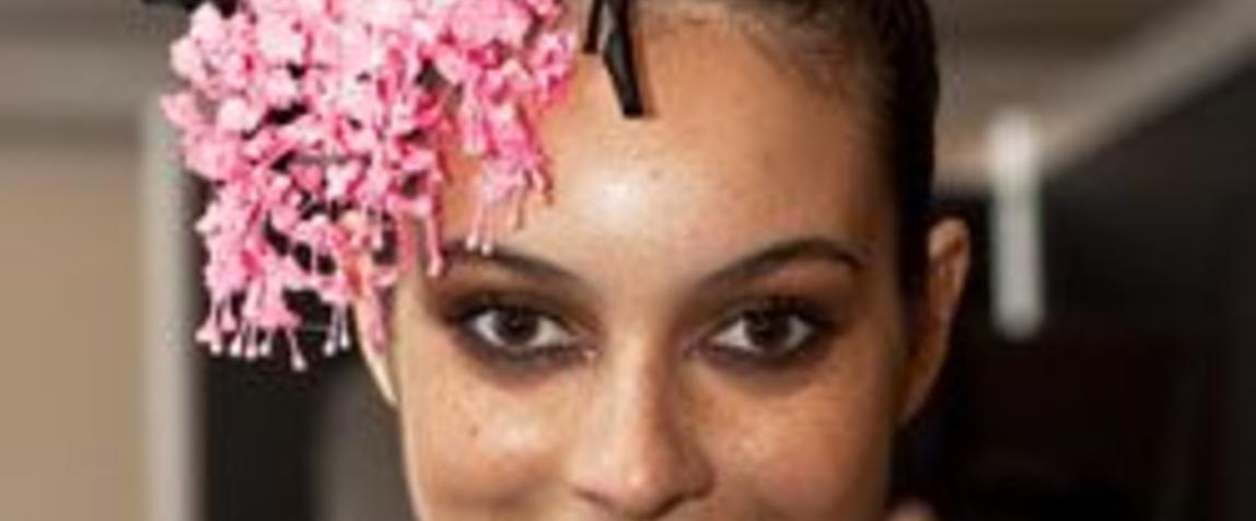 Hair style: "This is called Gypsette, and Gypsette is all about gypsies travelling the world. What we have is seven different worlds that we're creating today. Of those seven different worlds, the common denominator is the bun on the top - but the rest of the hair style is about the ponytail or the different braids that we're putting in that will show what the story is. We're doing Navaho Indians with fishtail braids, and when we get to Brazil, we've got very bright colourful pieces - so we've got a variety of looks that depict the different countries. I've used a bit of padding underneath, I've got a false piece of hair in the top that I've pinned in at the front and will cover over the padding to give me the base that I want. Next, we've attached the hair pieces to a comb and then put a braid in at the back to latch the comb into so it won't fall out when she walks down the catwalk. We're using all Goldwell StyleSign products, and we've been using the Hot Form to prepare the hair with and then we come back in with a little bit of the Diamond Gloss and a strong hairspray, the Magic Finish Hairspray. We then work in with the Sprayer, which is a factor five - we need a bit of a factor five to hold the whole lot together," says Sharon Blain.