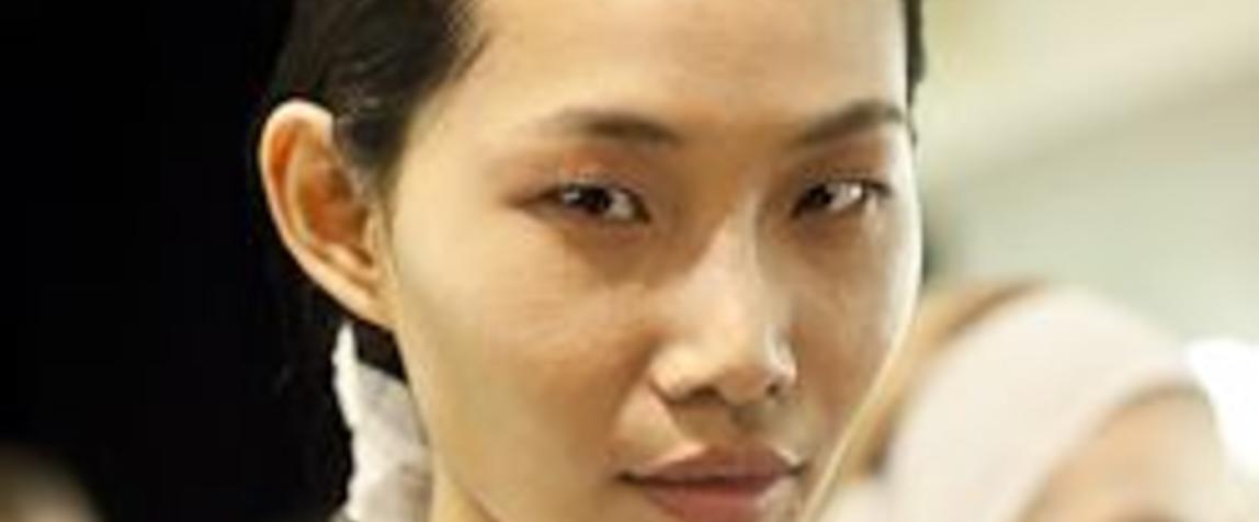 Make-up style: She’s the beautiful assassin. Christopher wanted her to look quite athletic, like she had just been working out. What we’re doing is getting the skin looking really fresh and hydrated, so really giving the skin a good massage with our Auto Pilot Primer to really plump up the skin  - not to give it a shine, but to give it a natural sheen. Then we’re working our Light Patrol Luminizer Wheel in the softer colours like pink ice and the silver up on to the cheekbone to give a bit more of a glisten but really buffing it into the skin so it doesn’t look too made up. With the eyes, it’s meant to look like that natural smokey eye that a lot of girls have – so it’s a bit of a sepia stain on the skin. We’re working our Color Disc Orange Sherbet around the eye first and then we’re coming back through with our Light Patrol Liminizer Wheel in the rose - which is the hero of this look. We’re taking the Luminizer over the top to take the skin from looking matte to having a sheen. Right before the girls go on, we’re putting our clear lip lacquer really strong on the eyelids so you get a glassy sheen when the girls blink. There’s not going to be much on the lips at all, it’s about the natural lip tone,” says Kate Squires.