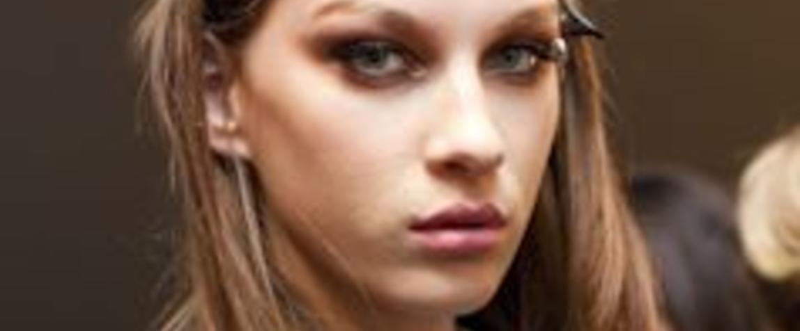 Make-up style: "The inspiration for the show in one word: luxury. It's all taken from the ancient idea of luxury. So each model that goes down the catwalk, they're meant to look like queens. We've given them beautiful gold smokey eyes. We're going to paste the eyebrows down and fill them with golden pigment. We've created lots and lots of intense lashes that look luxurious, ample and beautiful. Everything is in abundance in this look. We've also given the models beautiful dewy skin using highlighter on the cheek bones. And finishing the look with deep red lips," says Nigel Stanislaus for Maybelline NY.