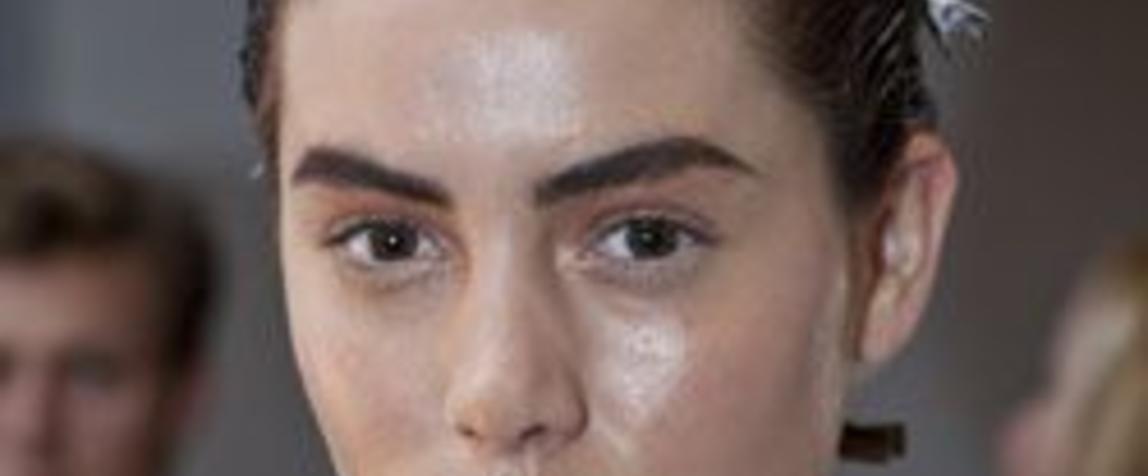 Hair style: "The hair look for Michael Lo Sordo is a wet look. We wanted it to reflect the feel of the clothes, it was very strong, almost slightly alien. We're braiding away a lot of the hair at the back to create a base we can work from. It reduces the amount of hair that we have in our ponytail but it also creates a base that causes the silhouette of the head to look slightly futuristic. It's almost like the girl got out of the shower, ran a brush through her wet hair and then walked out the door. Key products to achieve this look are Redken Guts and Redken Full Effect and then we're working with a little bit of Redken Stand Tough Gel and Redken Forceful 23 Hairspray," says Richard Kavanagh.