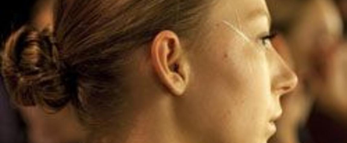 Hair style: "The hair today needed to carry a really youthful vitality to it, but it also has that lovely feeling as if she's been out at an late-night rave or out in the bush somewhere. It's got that look as though the morning dew and mist have started to settle on her and it's started to bring the hair down a bit. Any curl that was there is starting to fall away and she's just gently tucking her hair behind her ears. The idea of ears being exposed in this design is really a big part of it so it has that really casual style to it. We first blowdried the hair using Redken Guts 10. We blowdried at a really low volume and we put in a really low side part so it comes down towards the corner of the eye to give it a nice, romantic feel. We then went back through the hair with a curling iron and curled in a soft spiral, so it gives that really nice very low movement to the hair so it looks like quasi-natural. We then went through using Guts again, we started to section out the hair and push the Guts into the hair so it gives the impression of hair that has had mist settling on it. We then pinned the hair into place, weaving it out a little bit on the left hand side so it has that innocence to it and then showing the ears, pin it round and then let it dry naturally. There's a slight gapping at the front too so the hair's not perfectly raked across the face. The reason we do that is to give it that post-party feel," says Phillip Barwick.
