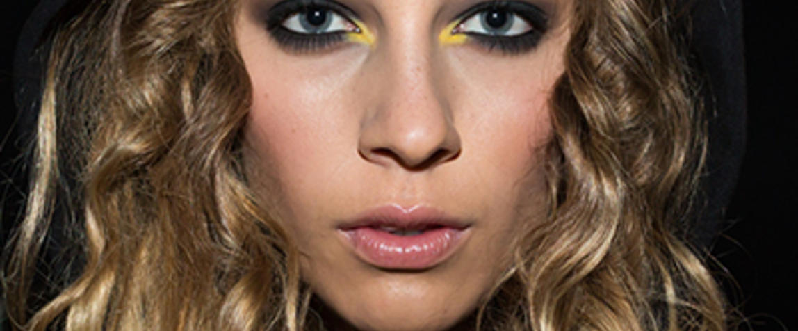 Add yellow detail to inner corner for focus. Use Black Jet eyeliner on lash line to add depth. Add lashings of Mascara top and bottom.
