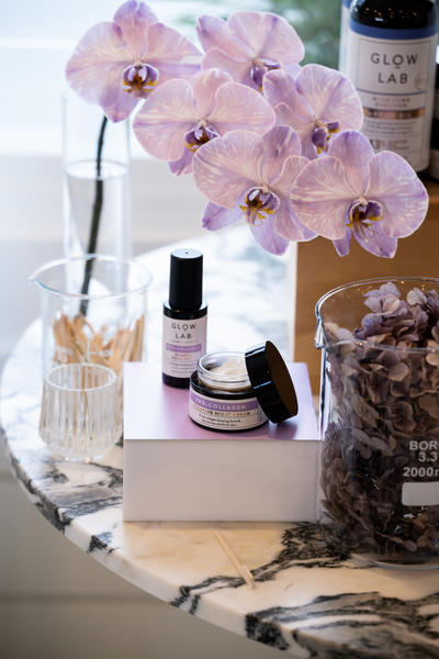 The Glow Lab Pro-Collagen Plumping Facial Serum helps to kick start collagen production and boost hyaluronic acid levels in your skin during the day. While the Pro-Collagen Plumping Night Cream works to repair skin while you sleep and retain moisture.
