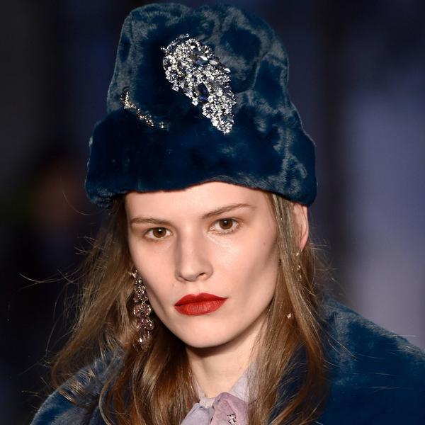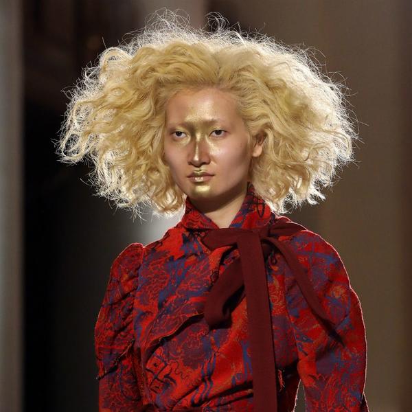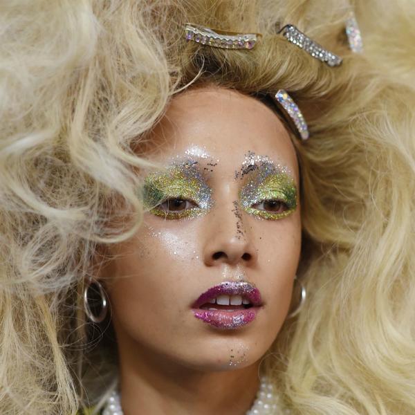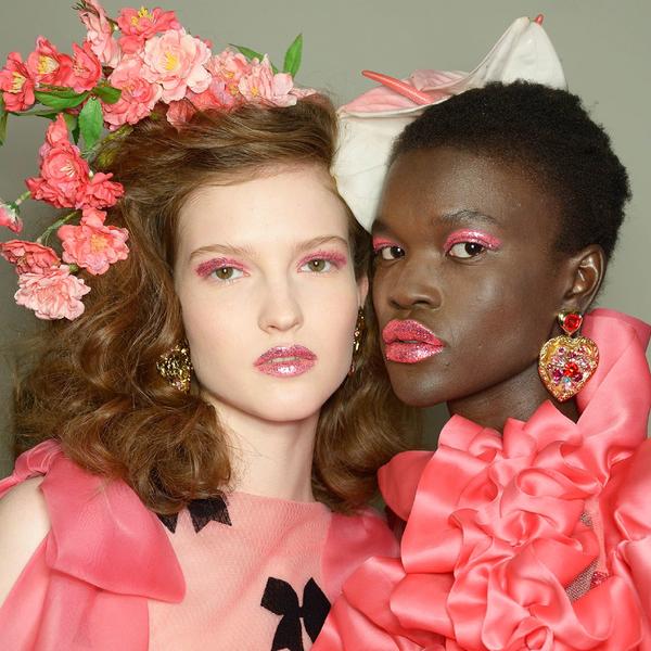 At Rodarte, fuchsia, pink, and red lipstick was used as a base, swiped onto eyelids and lips, followed by colour-matched glitter that was pressed on top. “We were all feeling a bit 70s,” said makeup artist, James Kaliardos, who turned to Bob Fosse musicals for inspiration when dreaming up the monochromatic glitter-lids-and-lips combo.