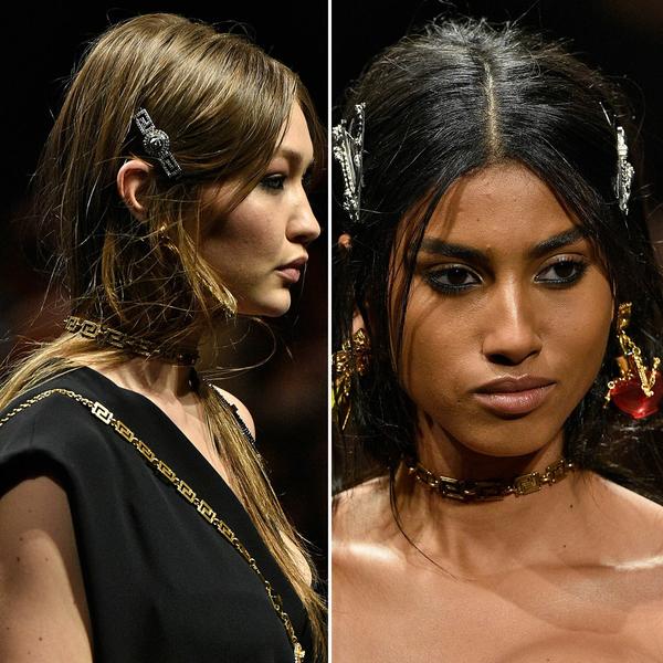 Hair accessories were also aplenty, with models donning headbands at Ermanno Scervino, glam-rock inspired clips at Versace and fitted caps at Sportmax.