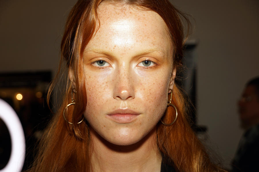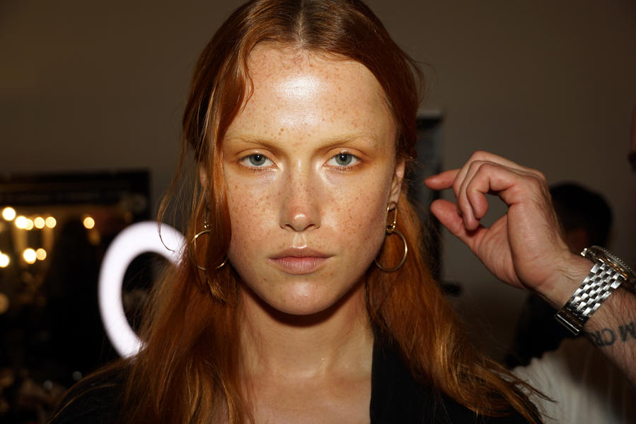 “Today for Deadly Ponies we’re going for shiny, happy, hippy, cult. All the models are related, and it’s the summer so they’ve seen too much sun. We’re creating characters in a cult today instead of a full beauty, glamorous look. Throughout we have really beautiful ochre tones and bronzed tones; and I’m starting by drawing freckles on the models with our lip liner pencil where they would actually get freckles. The pencils we’re using are Stone and Cork. Another important part of the character is bigg, bushy brows that we want to look like they’ve never been touched by tweezers. To do this we’re using the M.A.C Brow Pens where we can create individual hairs. No mascara on the eyes, we’re just doing a halo effect with eyeshadow and then talking the Prep and Prime Bright Forecast Highlighter and placing it in the corner of the eyes.”
