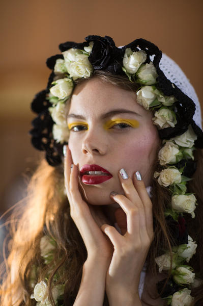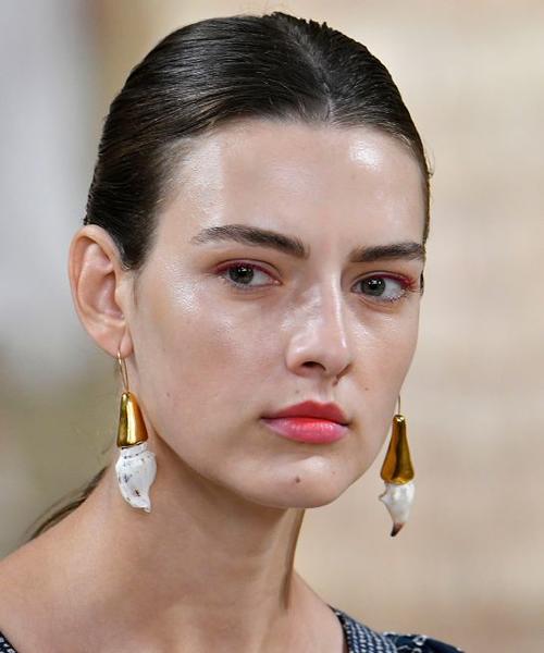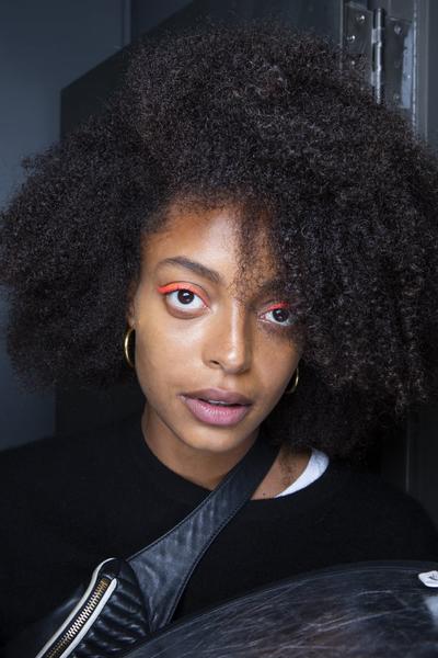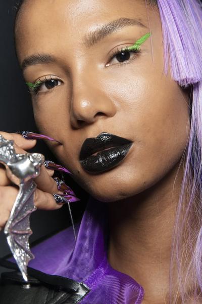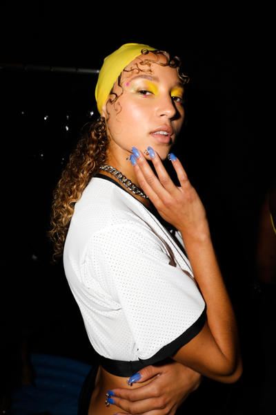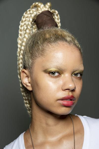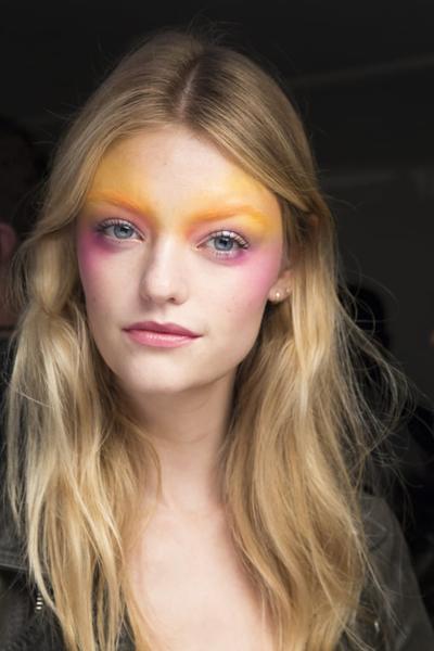 Pastel-coloured eye shadow and check highlights were noticeable makeup features at numerous shows. At Chromat, M.A.C’s Fatima Thomas used pastel yellow in a wash across model’s eyes. At Anna Sui, Pat McGrath put watercolour-like washes of yellow, orange, and pink that blanketed the eye area and faded into the brows, temples, and cheekbones. Taking a break from yellow, pastel-blue and pink Nars shadows were painted on the eyes of models at Rodarte.