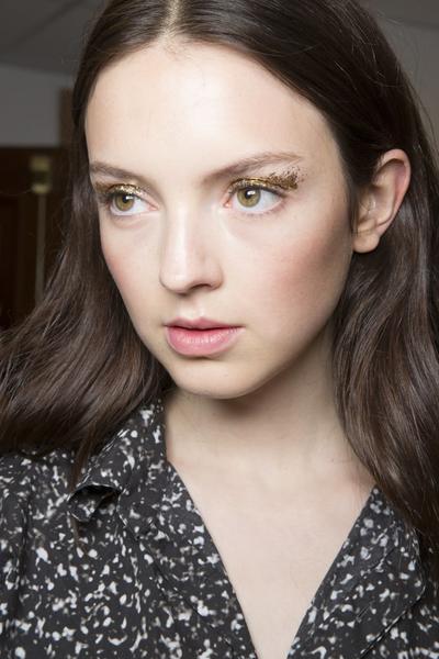 Stepping away from bright colours, gold eyeshadow was a feature at Kate Spade, Kim Shuigold, and Tom Ford. At Kate Spade the models wore gold glitter swept across the eyelids in a tribute to the late designer; and at Tom Ford, lead makeup artist Diane Kendall told WWD: “It’s a little bit Seventies with that feeling of super glamorous women.”