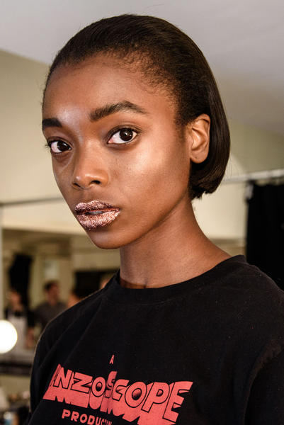 At Jeremy Scott, makeup artist Kabuki created a glittery lip look inspired by Scott himself. The lips were initially meant to be created using lip foils glued down with lash glue. M.A.C glitter was put over the top for the finished look.